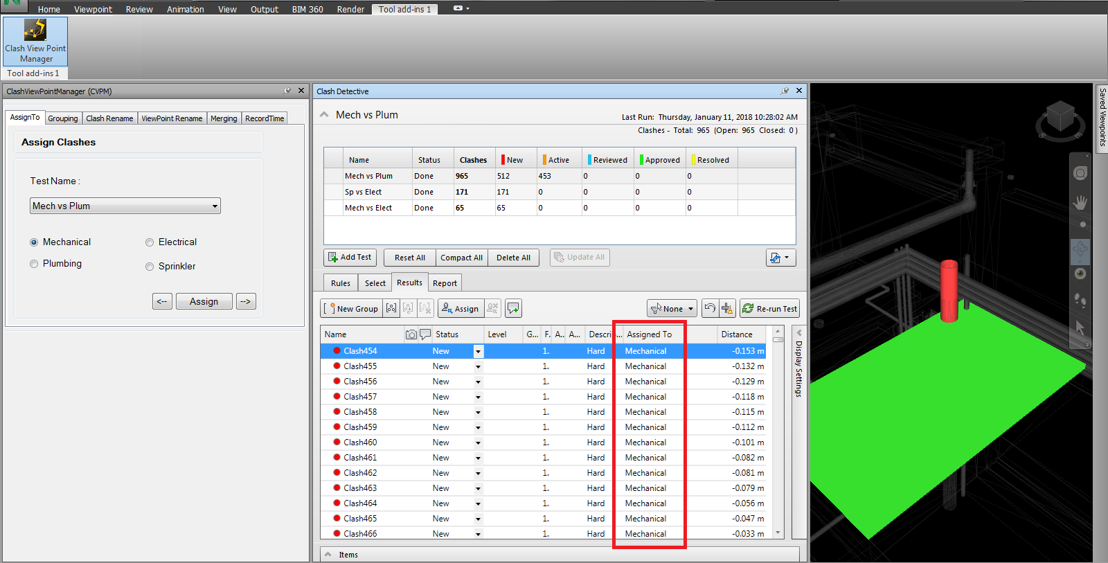 1) Assign To: This option allows you to assign clashes to respective Test Name by selecting Mechanical, Electrical, Plumbing and Sprinkler trade type.
