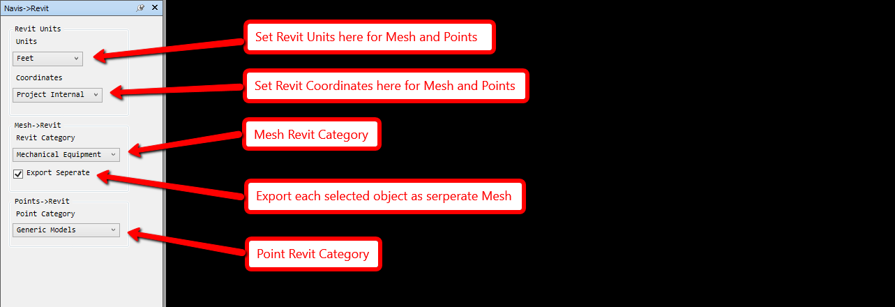 Be sure that the correct Revit Units are selected in the Revit Units Dropdown within the "Navis->Revit" settings panel. There is a section of the "Navis->Revit" panel labeled "Points->Revit". It is from here that you can choose what category the Point(s) will reside on in Revit. "Points->Revit" uses the Point to Point measurement tool to transfer points from Navisworks into the active Revit View. With a point (or points) selected in the model using Navisworks Measure "Point to Point" tool, you can select the “Points->Revit” button to draw a sphere (or spheres) in the last active Revit view accordingly.