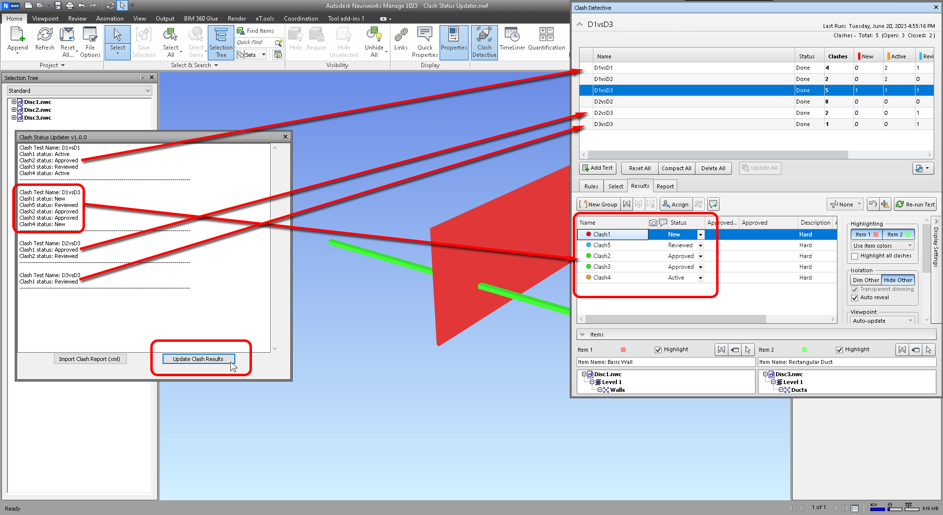 - The imported clash tests with the clash names and statuses are displayed in the tool's window.