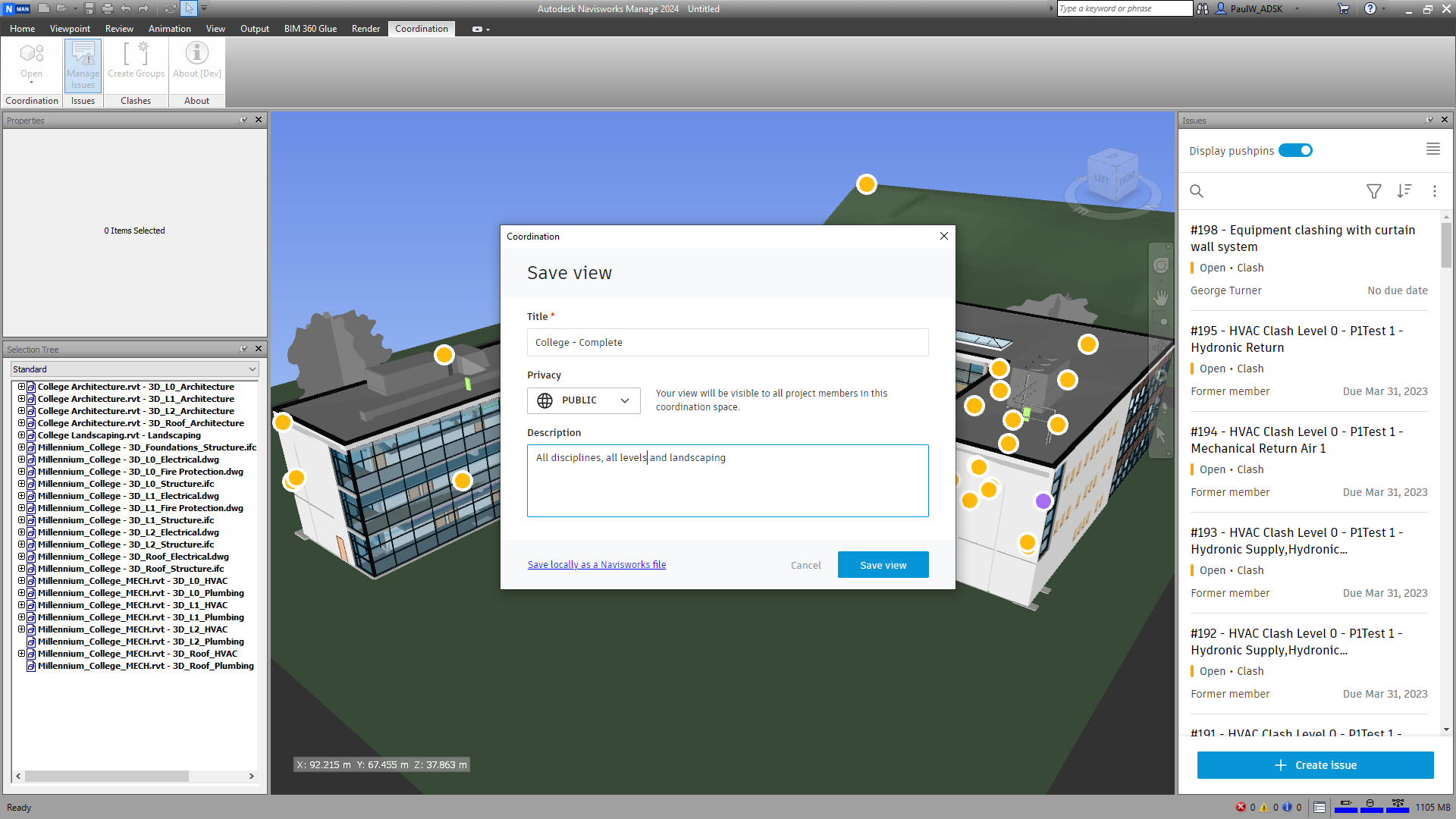 100% behind your comment. There is minimum integration with issues and clashes- which is what model coordination is for...how was this missed? And Issue pins XYZ or basic clash report exports are lacking in model coordination. If it is supposed to be Navis replacement for those who do not have the software, at least provide the basic clash features and ability to save tests and export results properly. Max The limit of 100 issues published from clashes is relatively low, and should be increased up to 500 minimum.