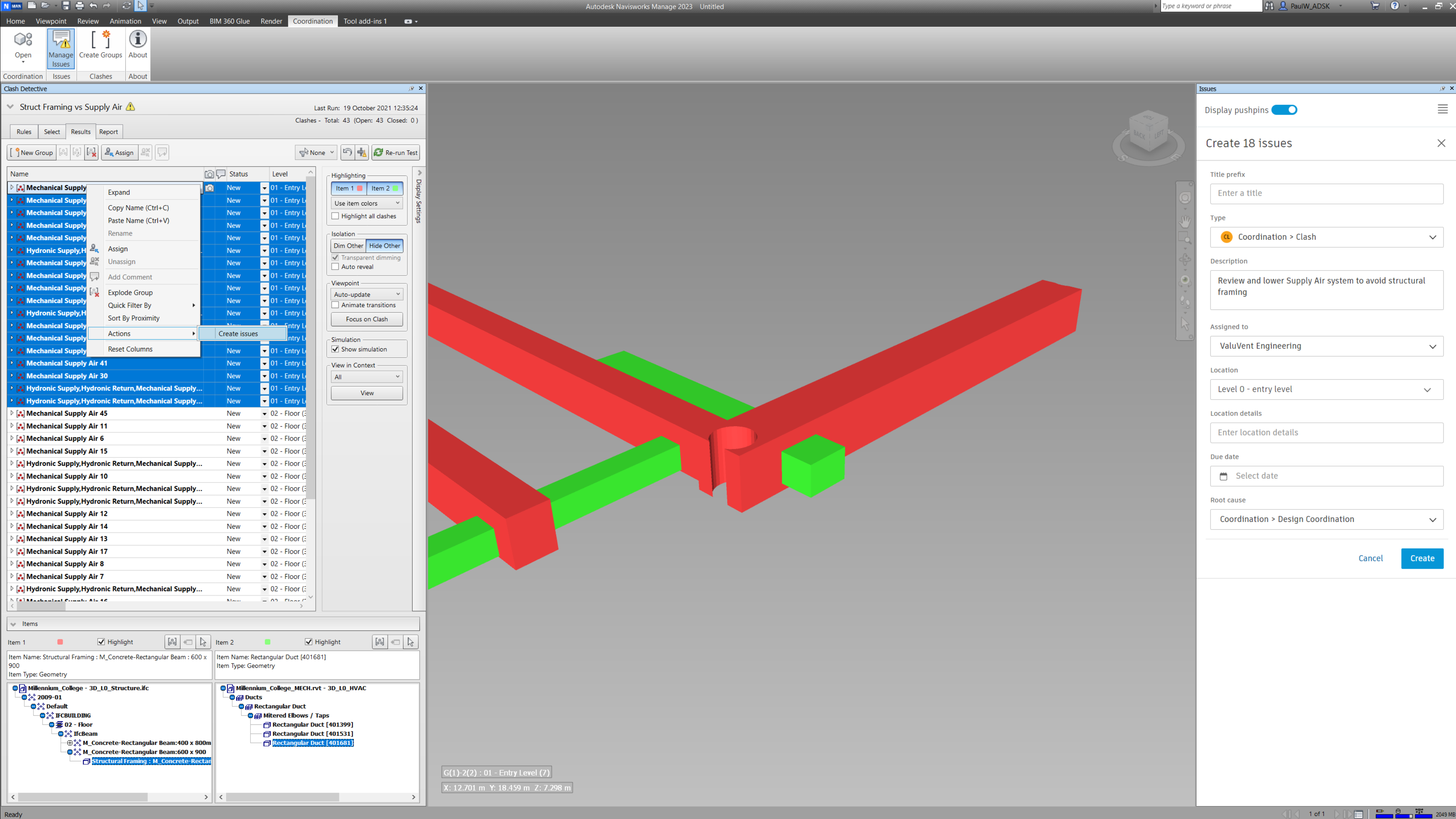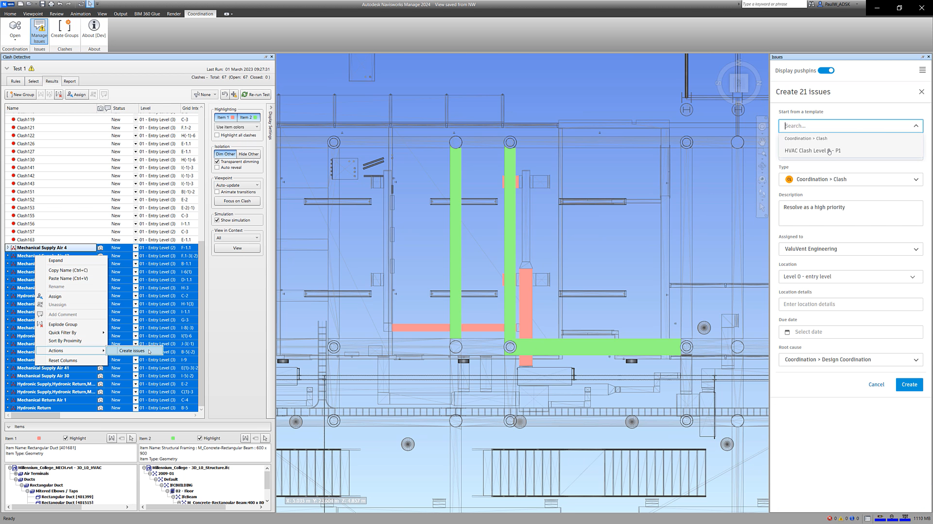 1 - Currently, you must select the clashes, then right-click to create issues from clashes. It would be great to create batch issues across multiple clash tests, e.g. from all new, or all active, etc. If so, the BIM Coordinator could go quickly through the clashes to filter out the false positive, then, at the end of the process, create all the clashes from the new or active ones. It would be great to have a panel where assigning an issue template for each clash test. That would incredibly speed up the process, as common workflows define the clash tests so that all the clashes in that specific clash test are assigned to the first model.