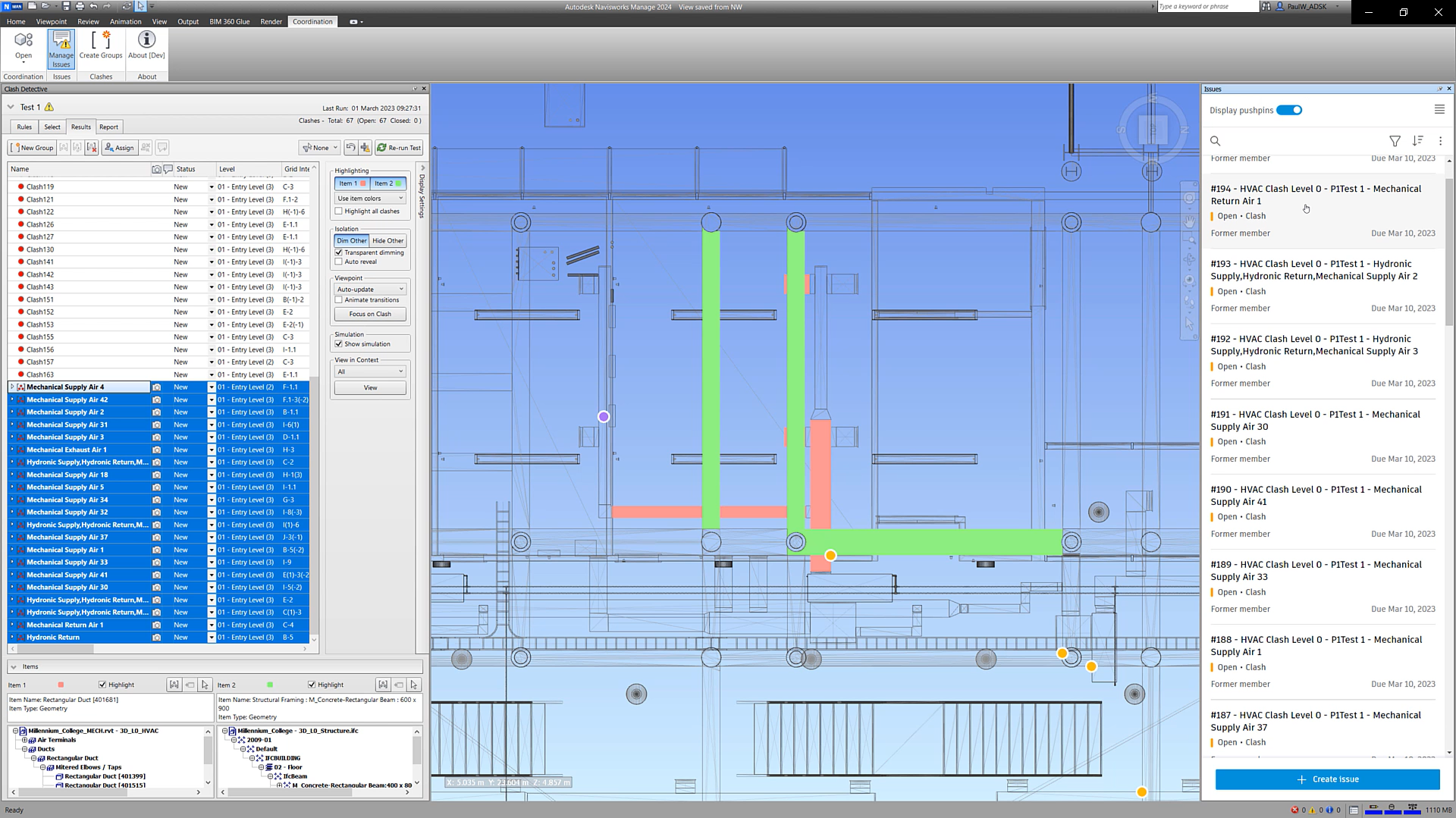 2. It is critical to create a clash-issues synch feature, so all the clashes geometrically resolved can be automatically marked as closed (or assigned a parameter, should the BIM Coordinator want absolute control on closing them). Manually closing issues is a very tedious process, and should be left for "custom" issues created by project memebers, not by Navisworks.