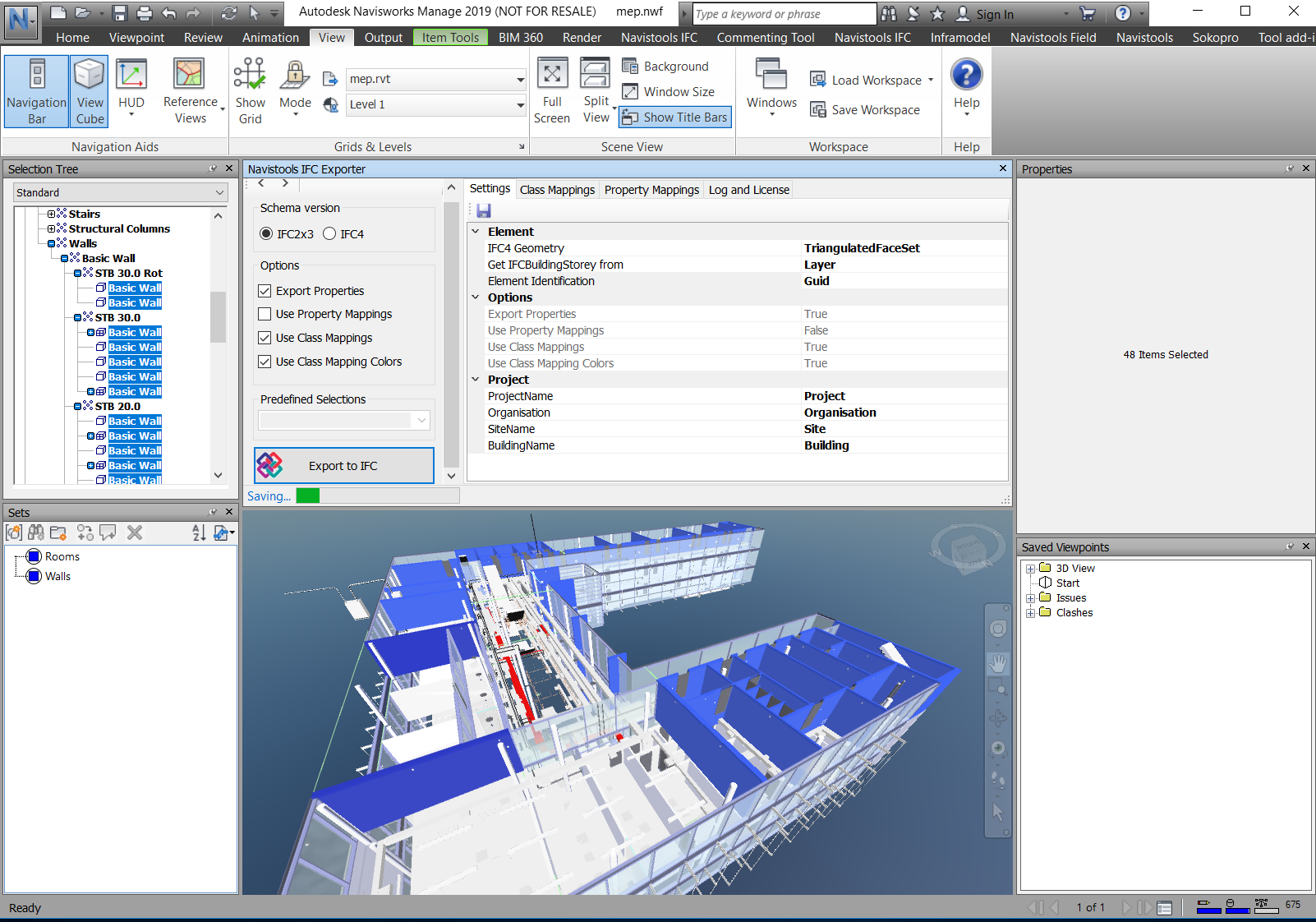 With IFC Exporter you can export any file (or parts of large files) that can be opened in Autodesk® Navisworks® to the IFC format (IFC2x3 or IFC4). When exported, Navisworks model items can be mapped to corresponding IFC objects. This plugin will export both the model geometry and the related data (Property Sets).