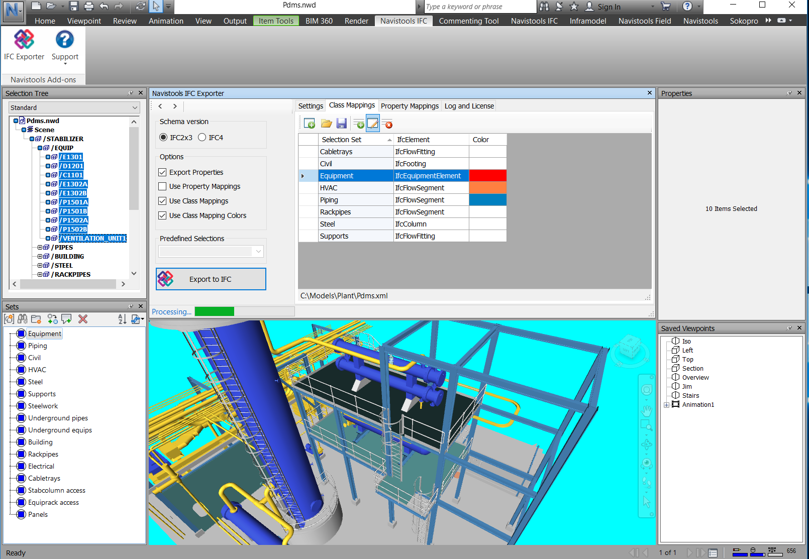 The plugin functions in 2 different ways. The straightforward way is to select model items (selection) that you want to export from the Navisworks model and export them without mapping objects. If using this way, all entities in the IFC file are represented as IfcEquipmentElement. The second way is to use object mapping. For this, you need to create a predefined selection or search sets for each different object type in the Navisworks model and tell the plugin which IfcType to use when exporting them.