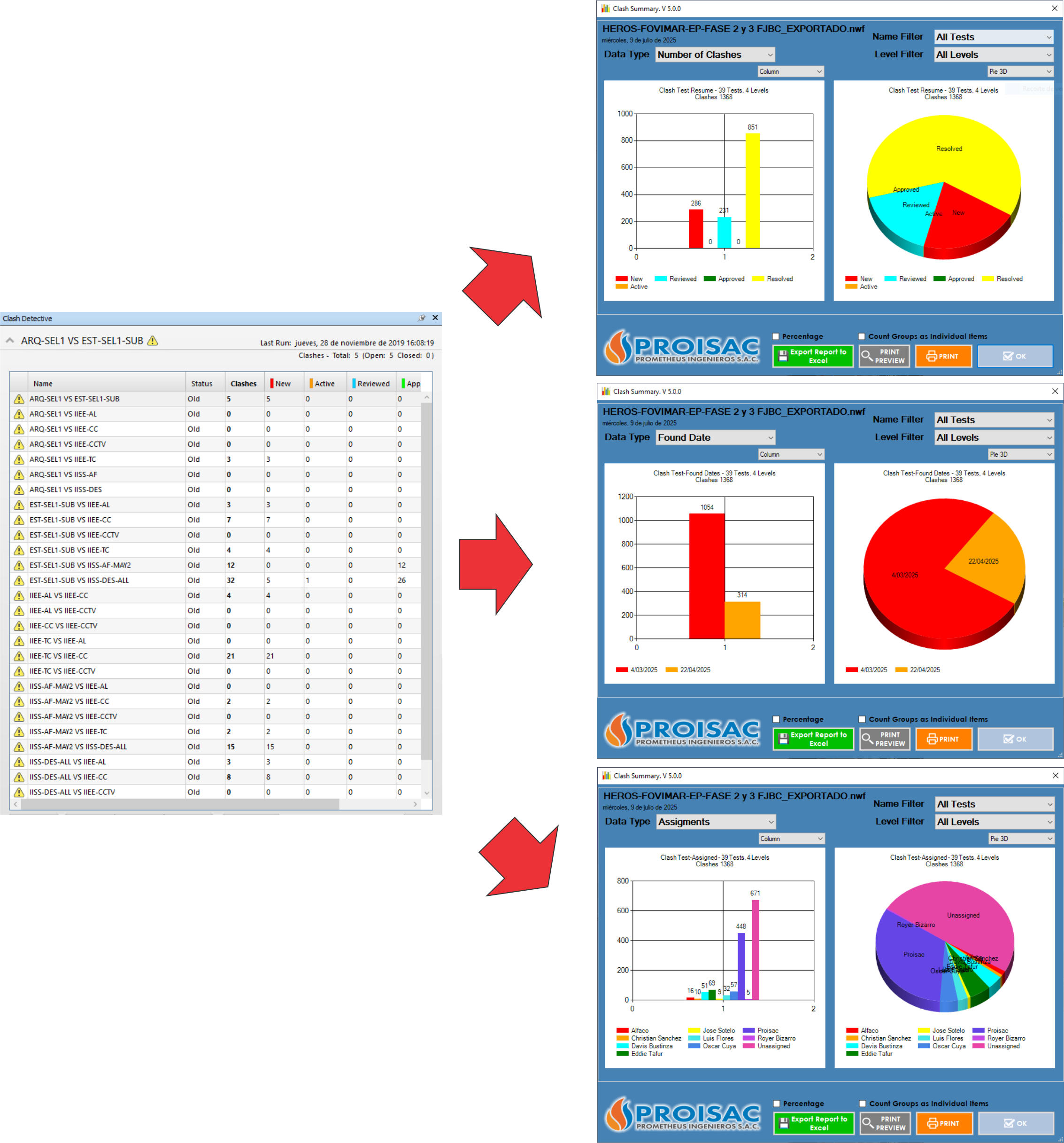 Instantly get a summary of all the Clash Tests in your project with graphs and export it directly to Excel.