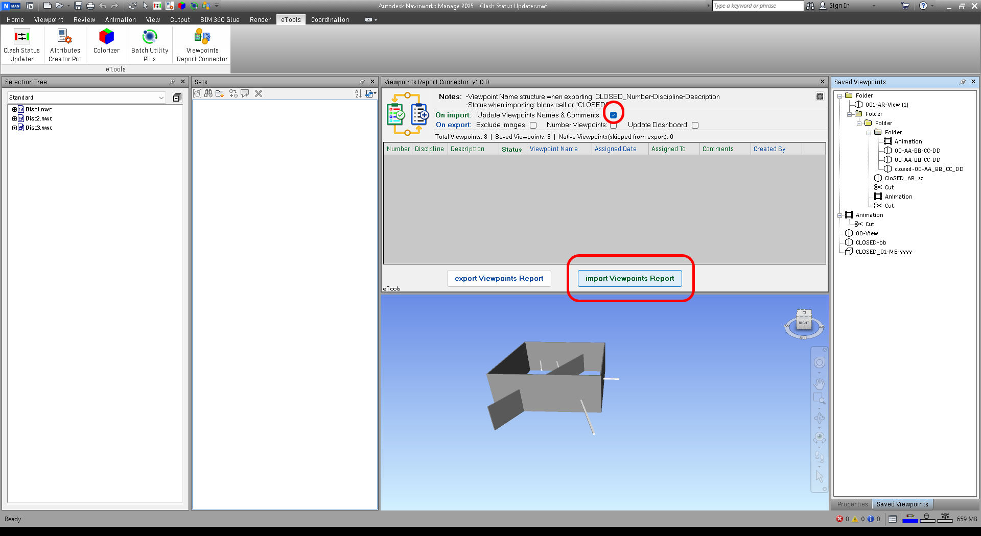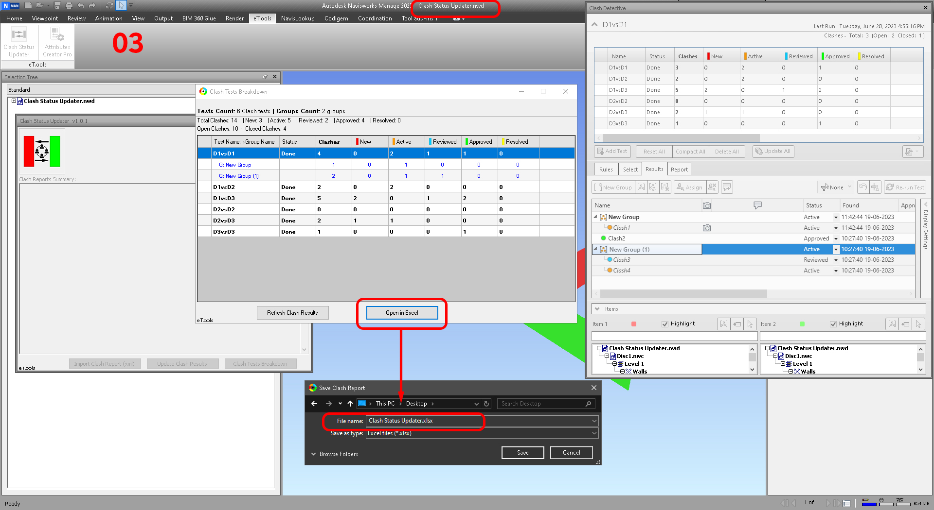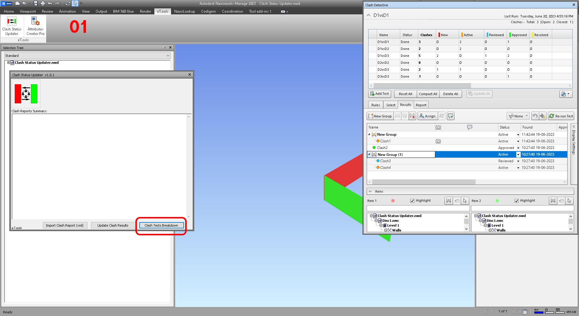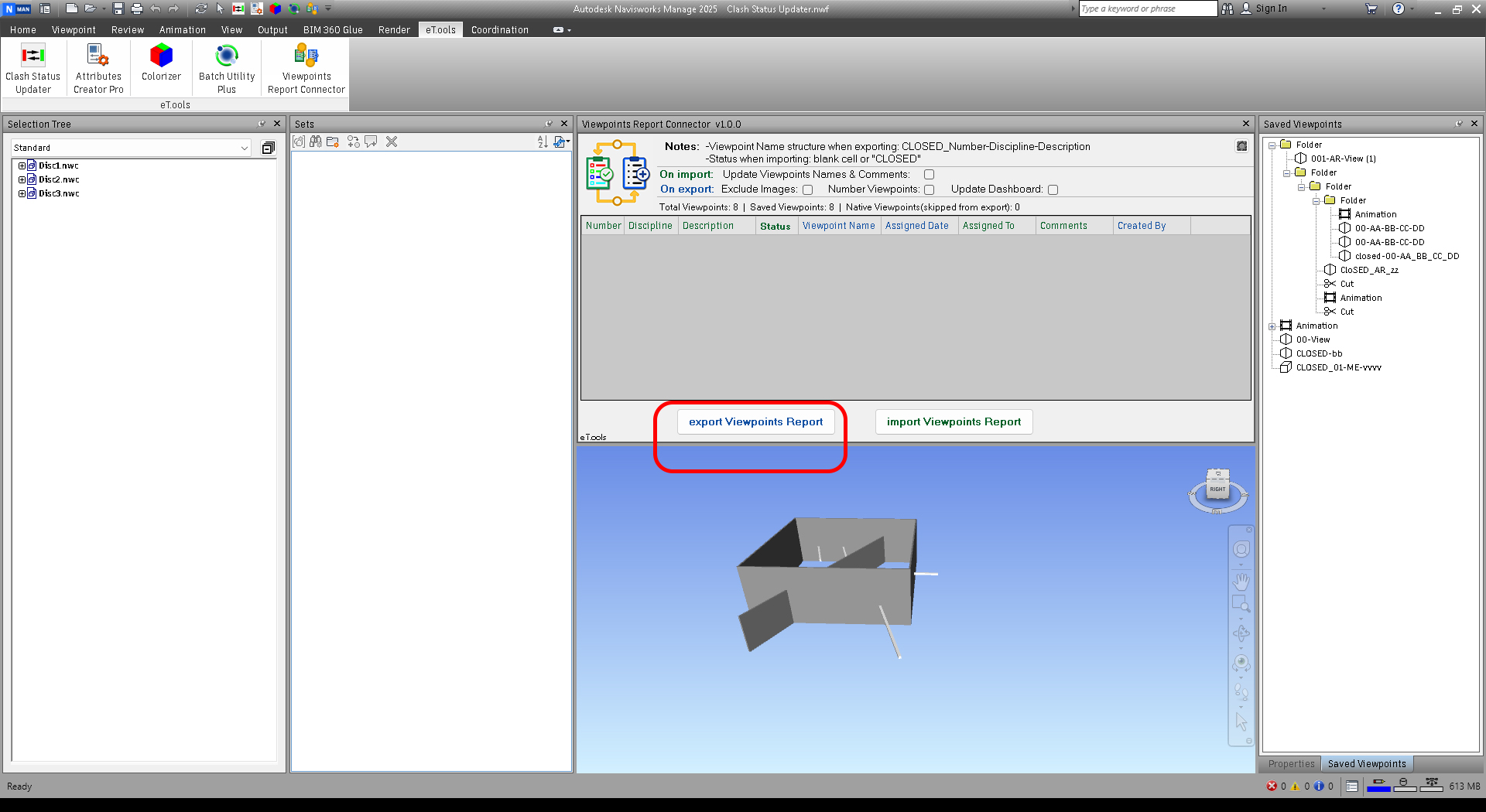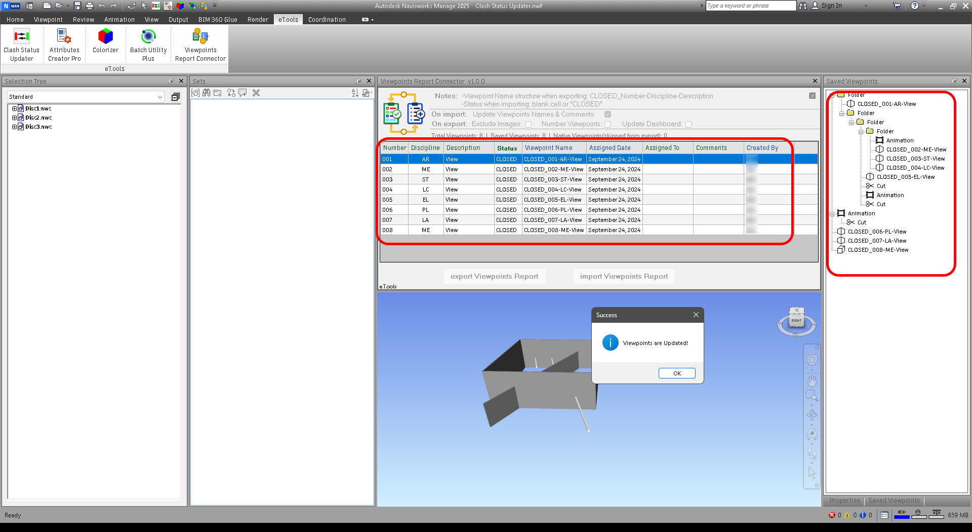 1-Clash Status Updater by eT.ools is an excellent tool to help BIM Managers of Lead Appointed Parties collect Approved and Reviewed clash statuses from the Appointed Parties and update the Clash Detective in their NWF files for clash resolution tracking over time.