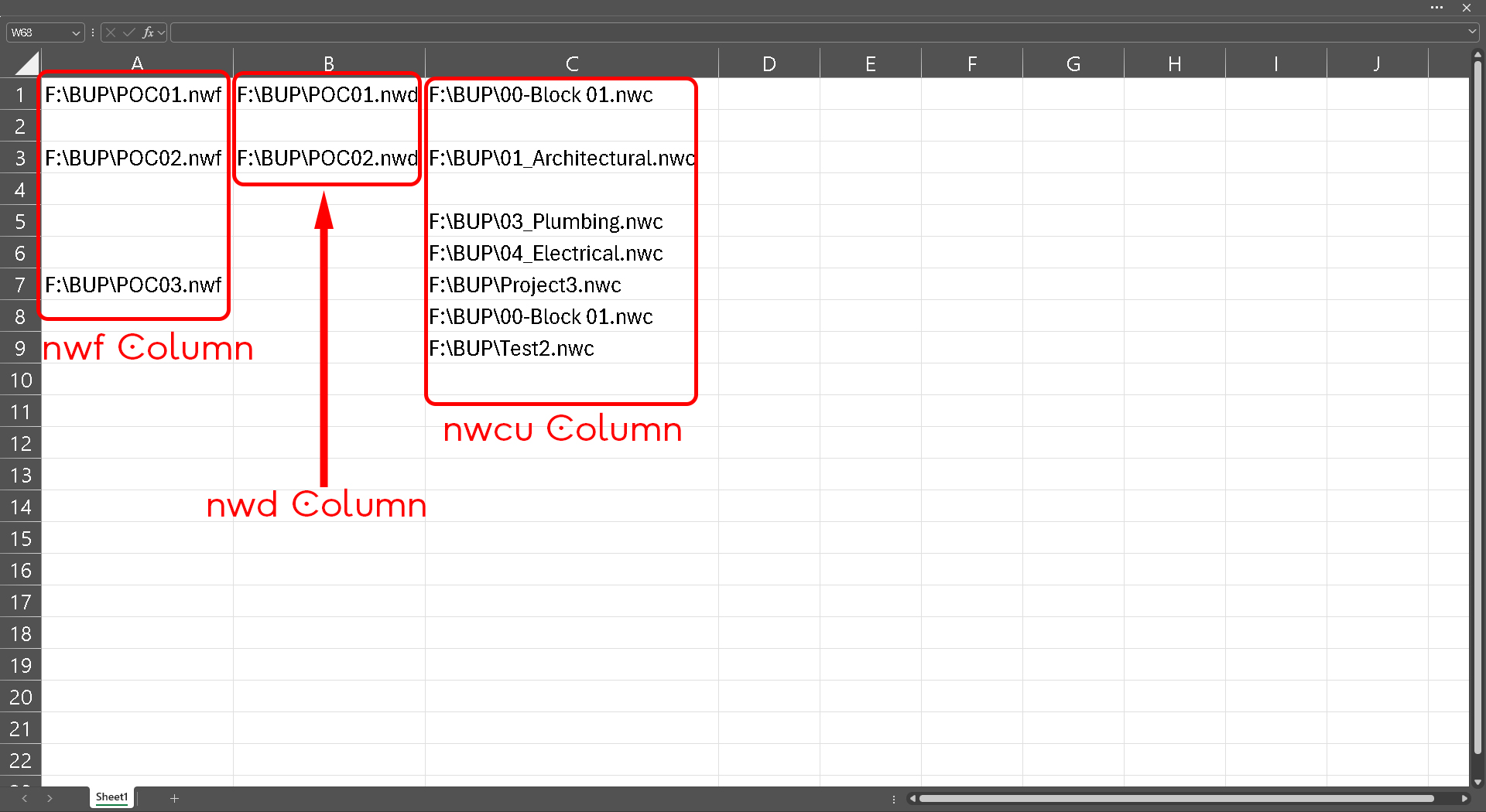 - If nwd is needed, the second column should include the full nwd file path and file name.