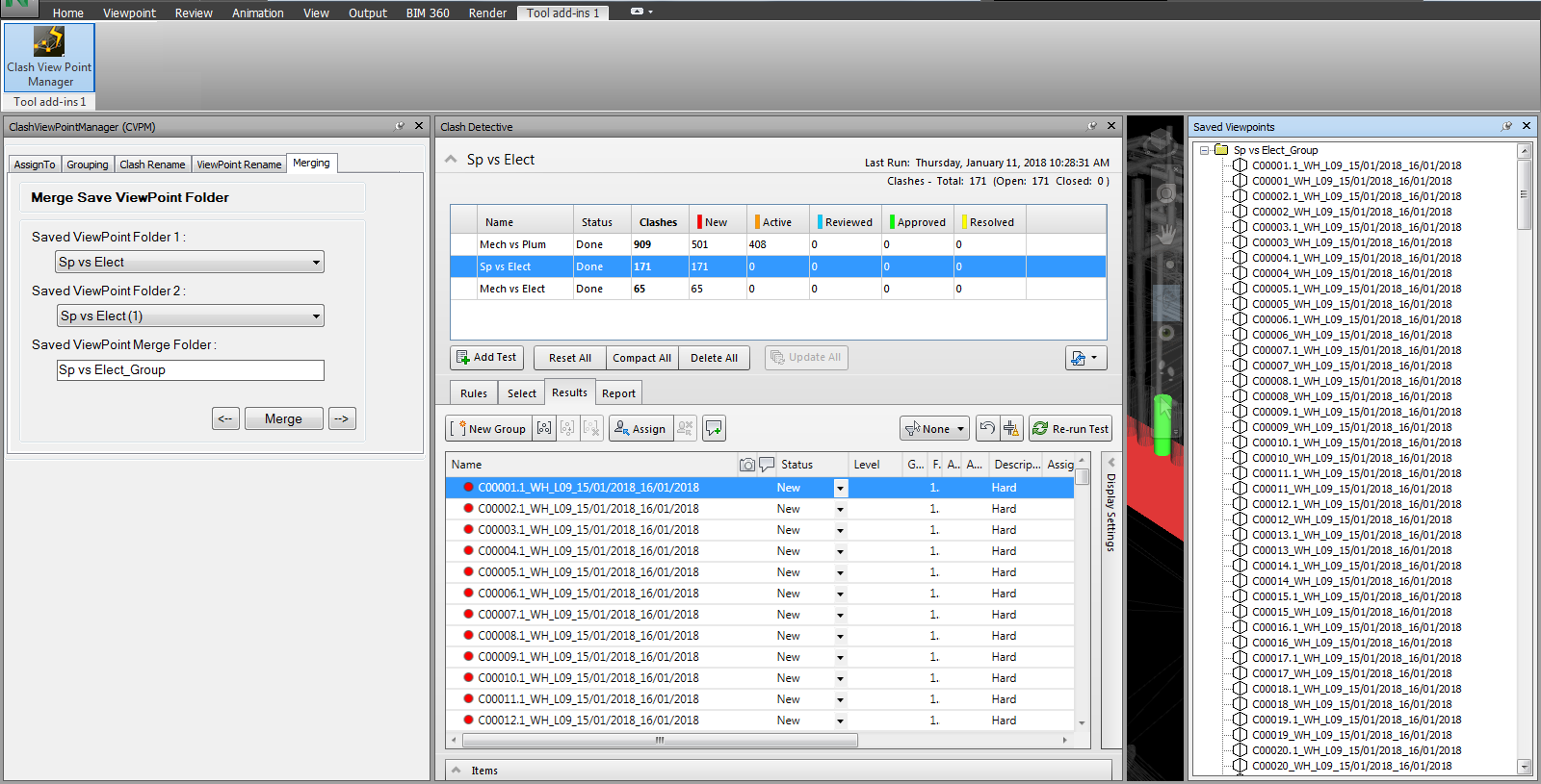 5) Merging: Merging tab allows you to merge viewpoints together i.e. Dim and Hide. This gives you a better understanding of the clash and the problems associated with it.