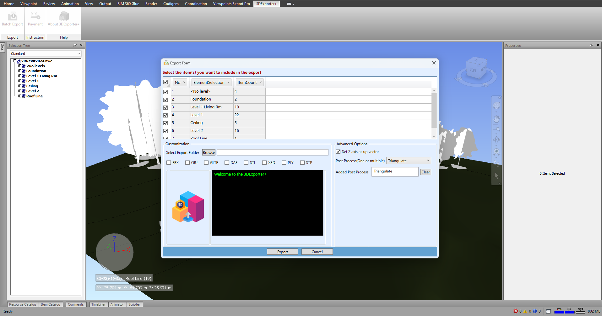 Tip: Only append the models into Navisworks that you will need to export, trying to hide unselected and export from a file with many models takes a very long time.