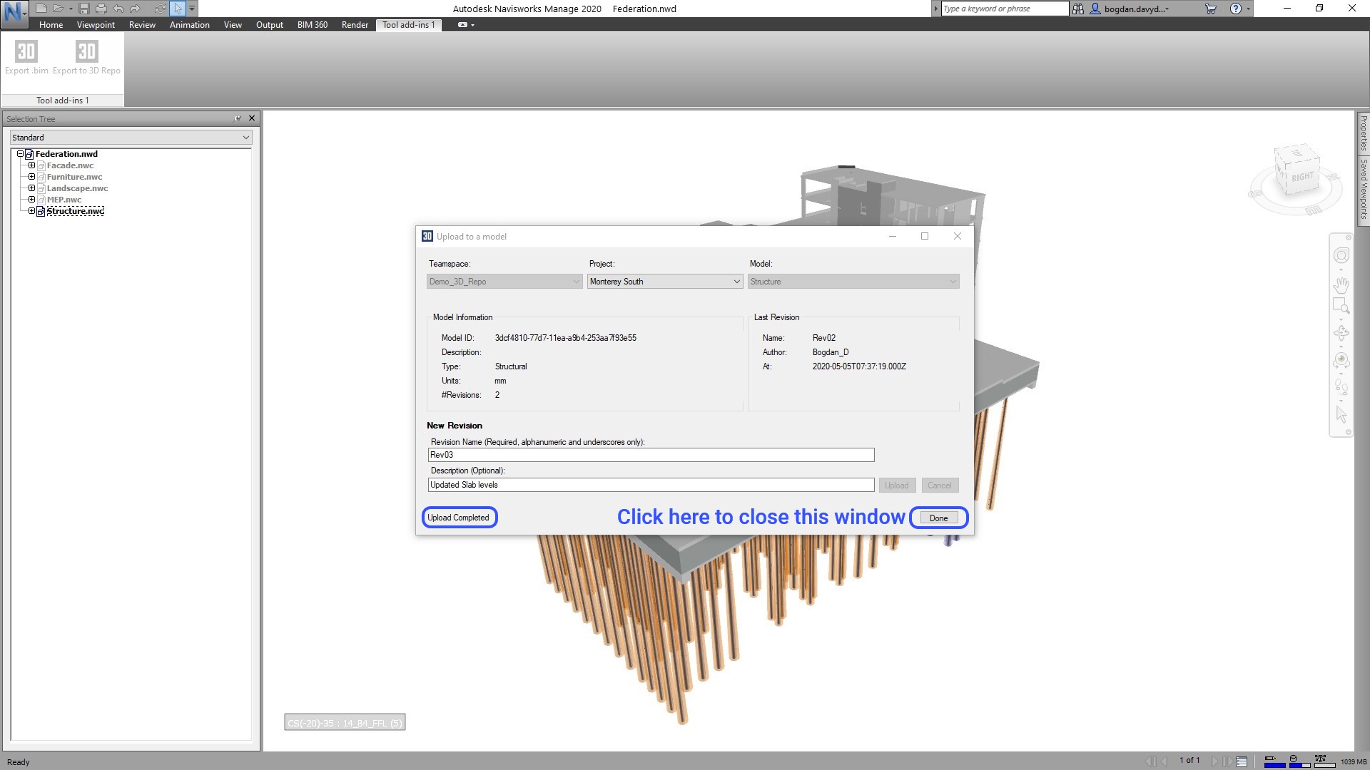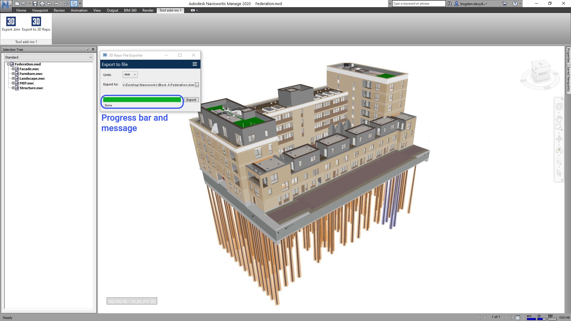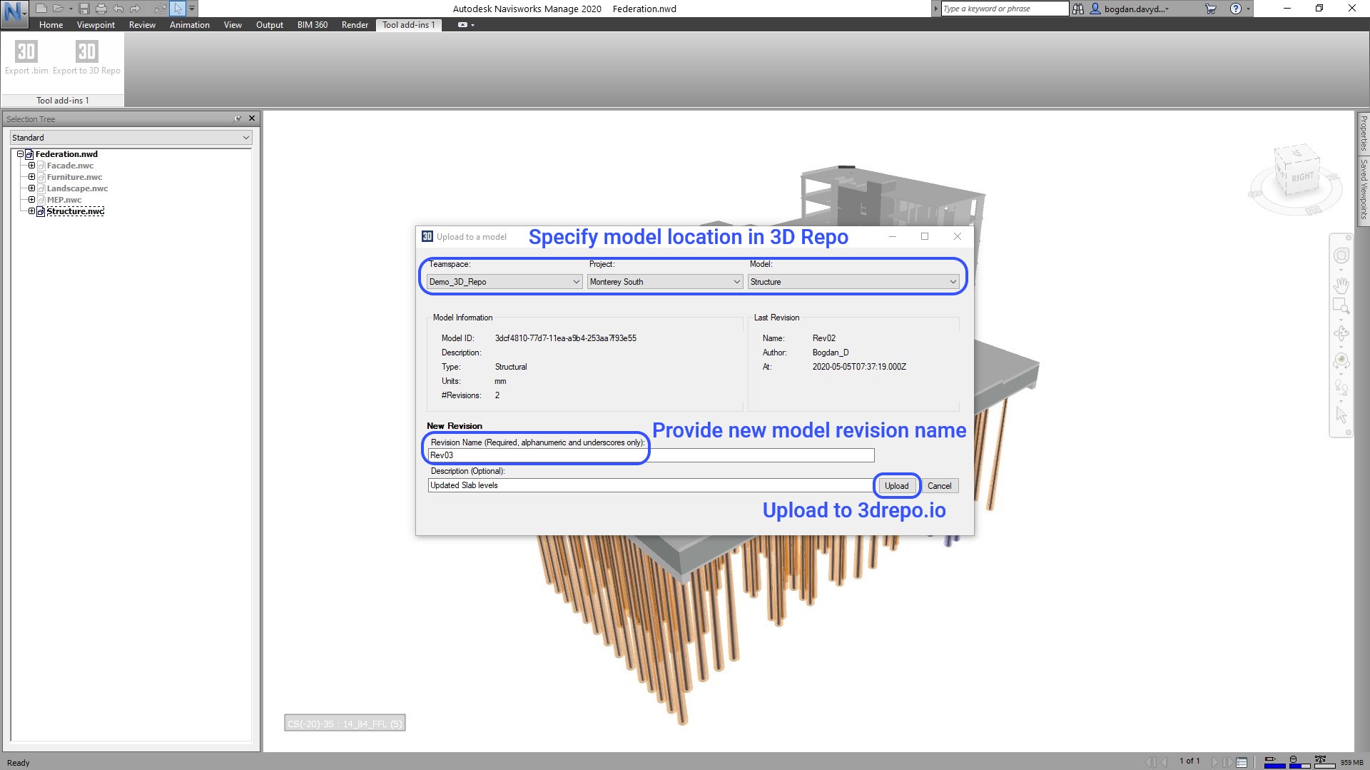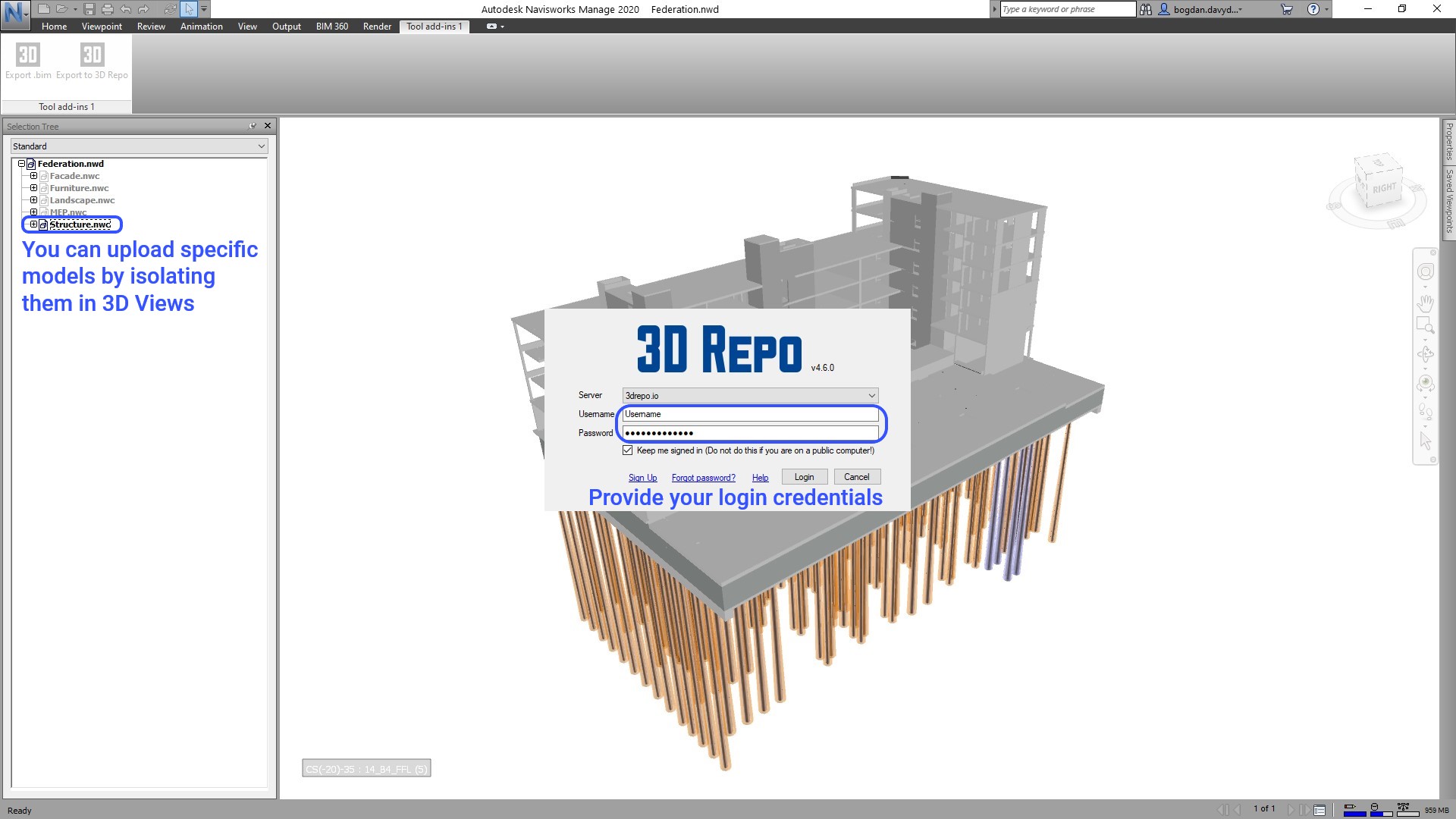 The Asite 3D Repo for Autodesk® Navisworks® plugin provides a convenient and simple way to publish models from Navisworks to 3D Repo and manage project Issues & Risks within the Navisworks environment. Issues & Risks created in 3D Repo can be accessed as part of day-to-day design workflow and exchanged with colleagues easily. You can push your models directly to 3D Repo within the plugin, or export your models into 3D Repo proprietary file format (.bim), to be uploaded through our web app.