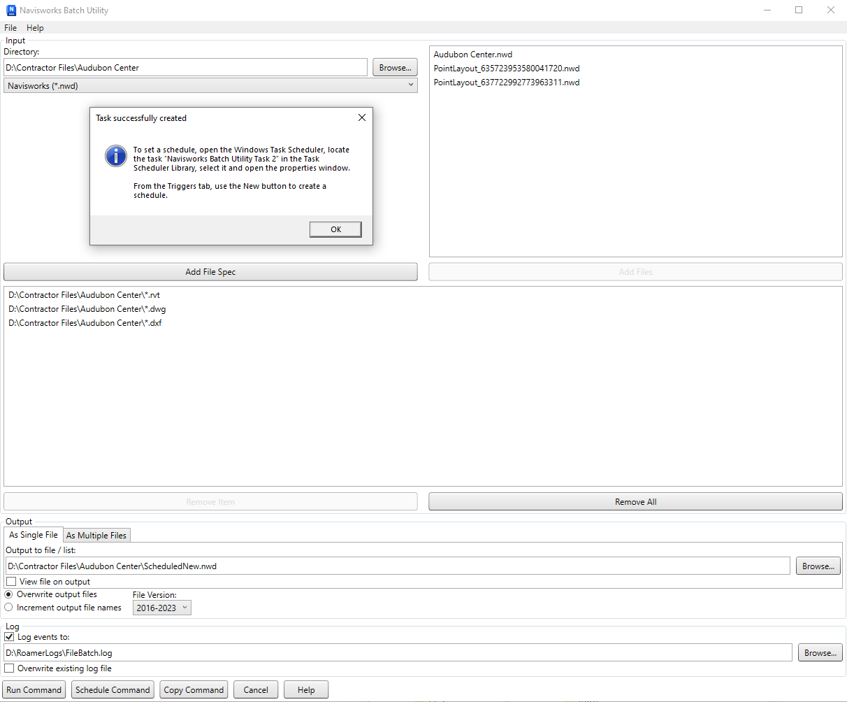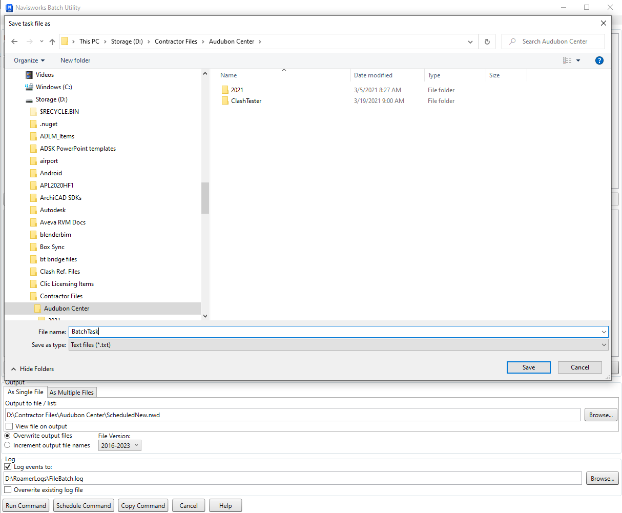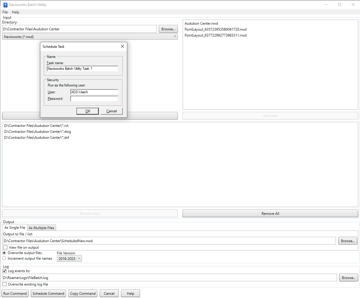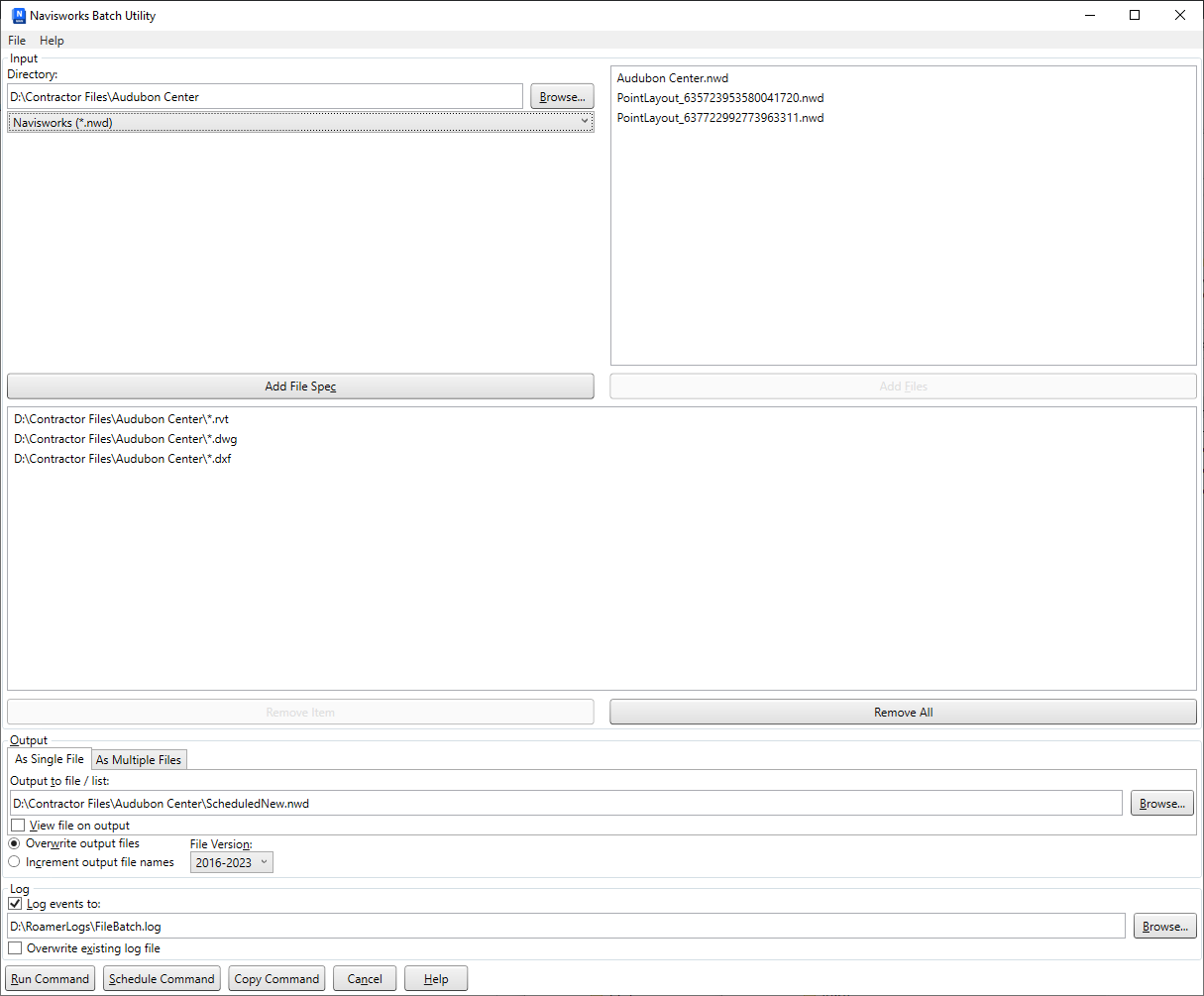 Important: You can use any of the currently supported file formats when you append or convert files with the Batch Utility. However, if you use any published NWD files as input, they must have been created with the May Be Resaved option selected, otherwise when you run the Batch Utility, no NWD output files can be saved. It is still possible to create an NWF output file.