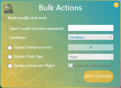 - Bulk Action: Applies batch modifications to clash tests efficiently.
