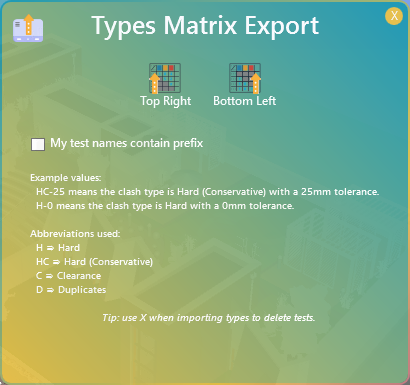 - Export Types Matrix: Creates a structured clash type matrix for analysis.