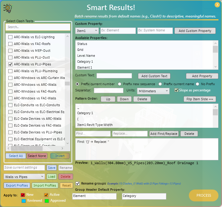 - Group Clashes: Organizes clash results into groups based on custom rules.