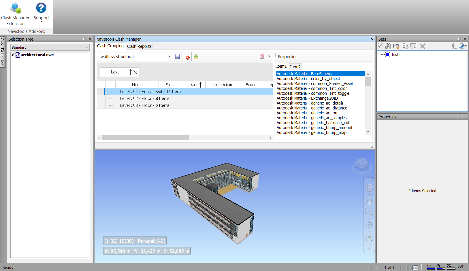 Clash Manager is a Autodesk® Navisworks® Clash Detective extension. It is easy to use but still effective tool for managing project's clash results. Clashes can be grouped by many options. If Navisworks model has at least one grid system, then clashes can be also grouped by levels and/or grid intersections.