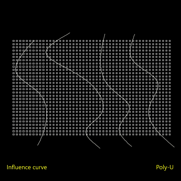 A curve affects a group of objects, causing horizontal displacement or compression. |