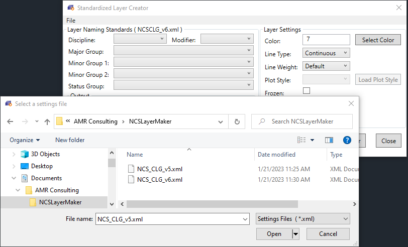 Use pre-defined settings files to develop a set of layers quickly using the National CAD Standards format of Discipline Designator (with optional subcode), Major Group, Minor Group, and Status Group.
