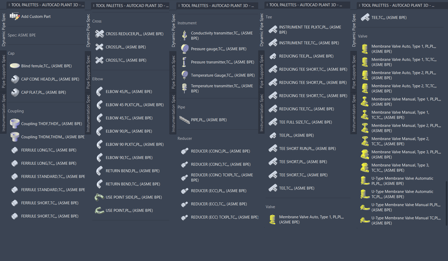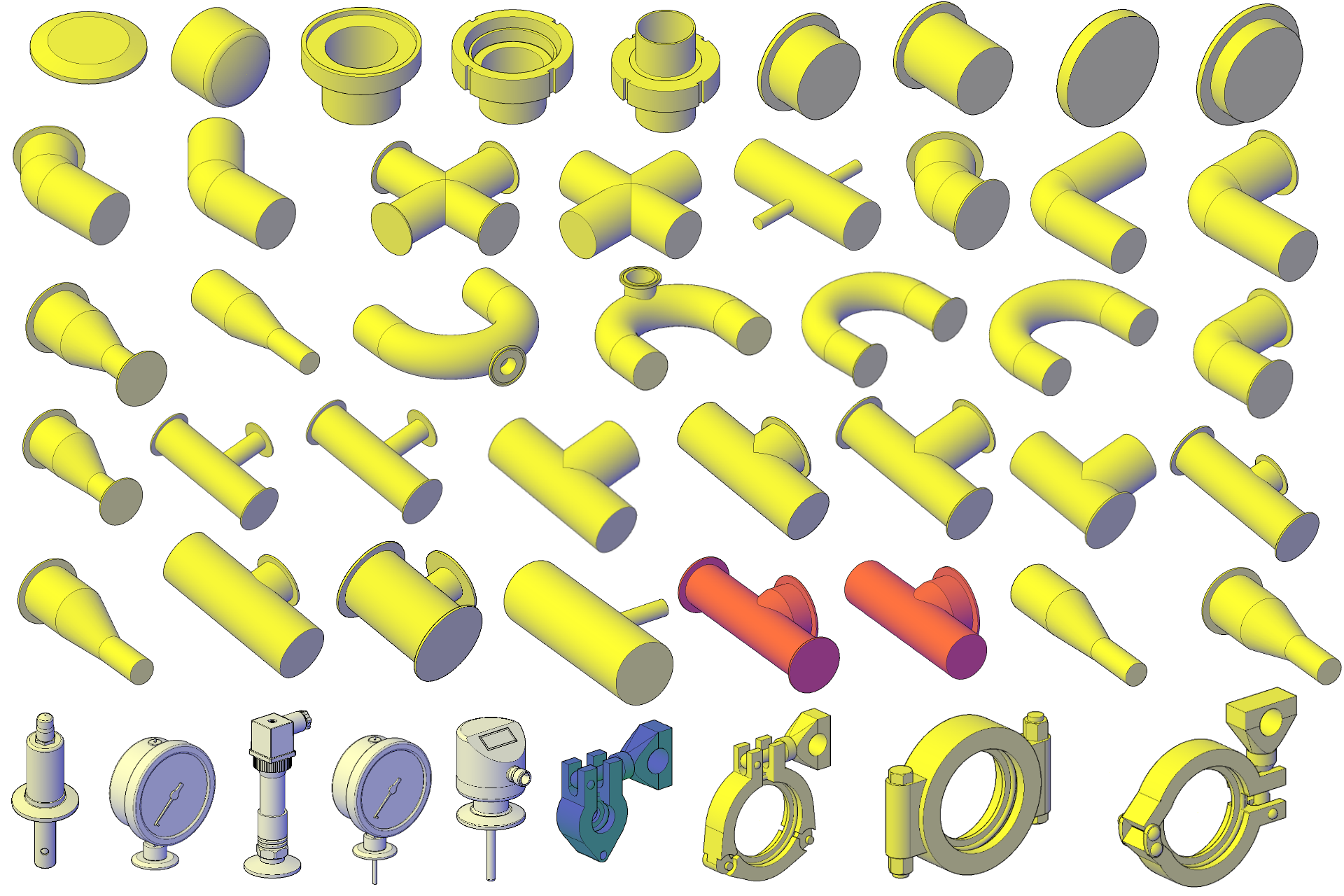 This catalog includes all common fittings, instruments and valves used in a pharmaceutical factory with ASME BPE standards. Highly customization components including Clamps, Coupling, Fittings, and Valves are Python custom script components. They are suitable for pharmaceutical and food and beverage projects in North America and worldwide.
