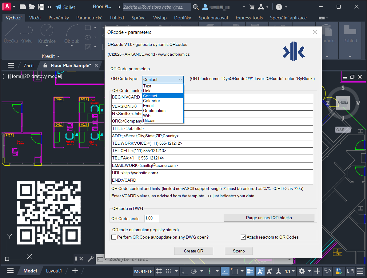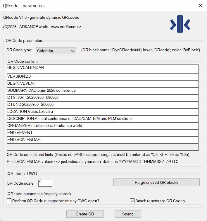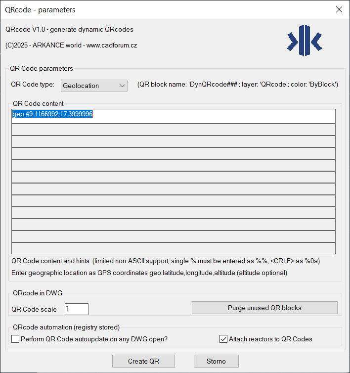 Unlike a trivial embedded raster image, the QR code here uses native Autodesk® AutoCAD® entities (the image is therefore sharp in any resolution, even in PDF) and the code can be subsequently updated either by manually editing the control attribute or by linking the control attribute to a field with any property or any content of the given DWG drawing - e.g. of a titleblock data, drawing name, job number, legend title, layout name, etc.
