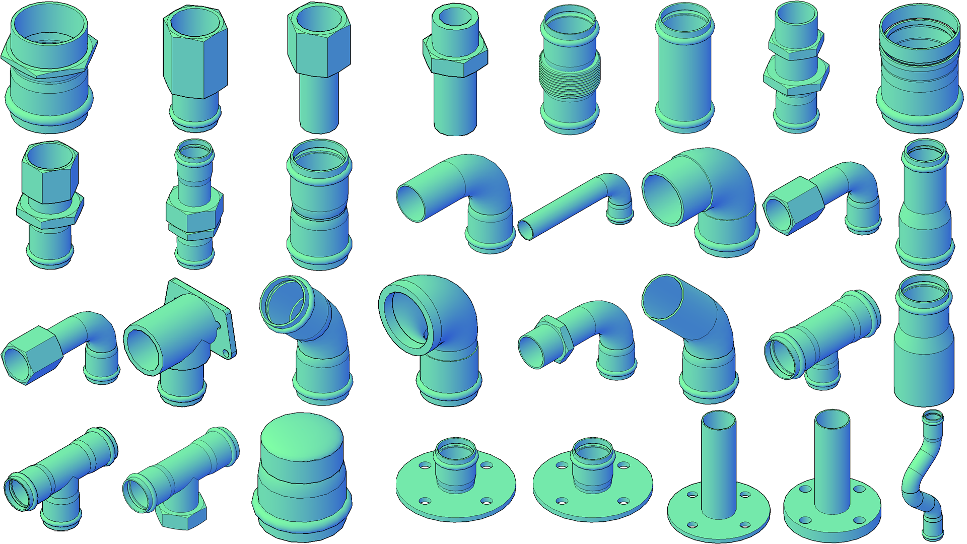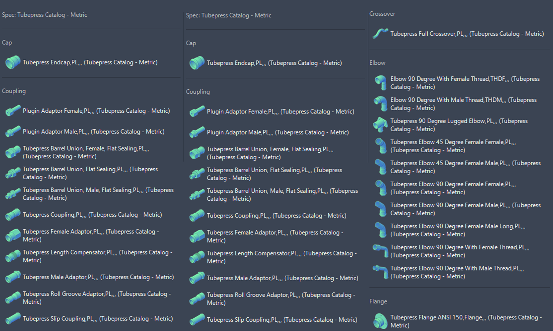- Includes a complete range of Tubepress-style fittings and tubes, adapted into fully parametric Python parts for Plant 3D.