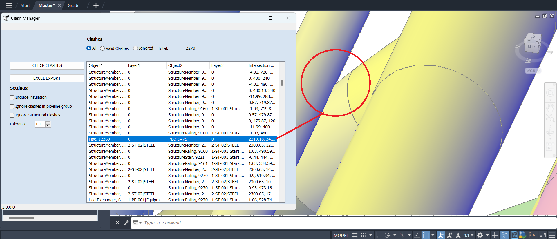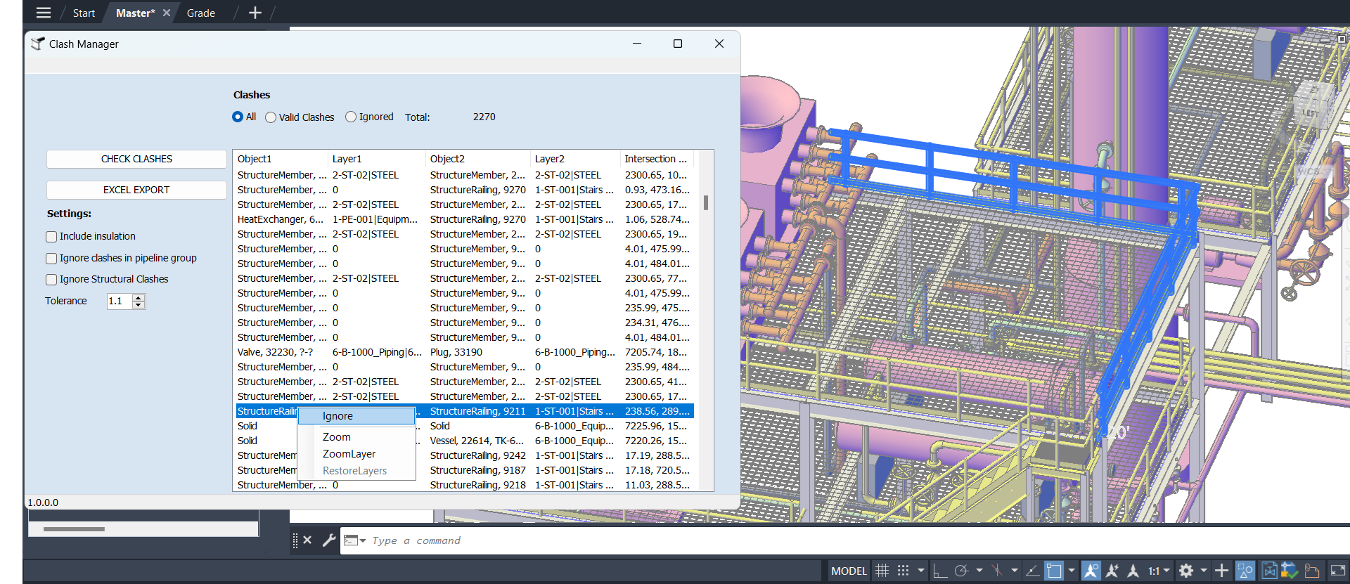 Efficiently check your master file for clashes in minutes. Navigate directly to clash locations in your drawing with a single click. Clashed objects are highlighted so the user can see in detail and decide if the clash condition is serious or can be ignored, ignored objects are separated in a list and can be resumed later, preventing information overload and helping the user to focus only on essential clashes without missing any clash.