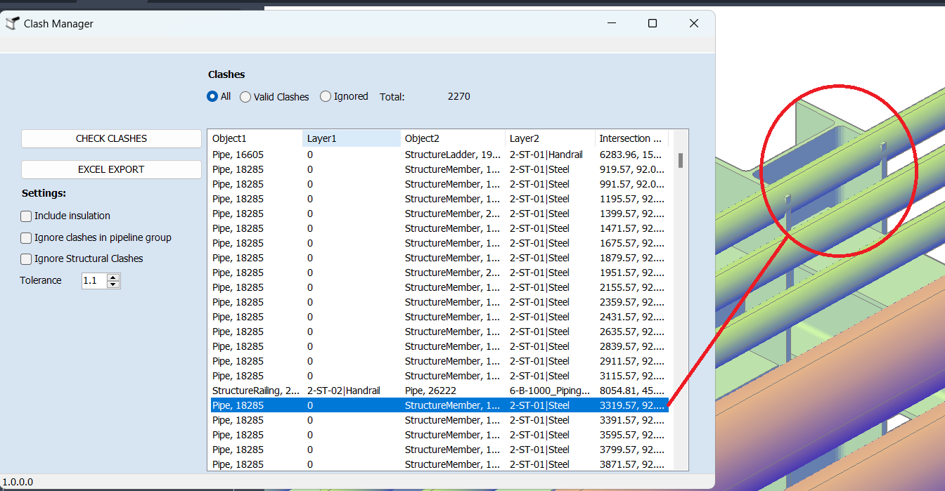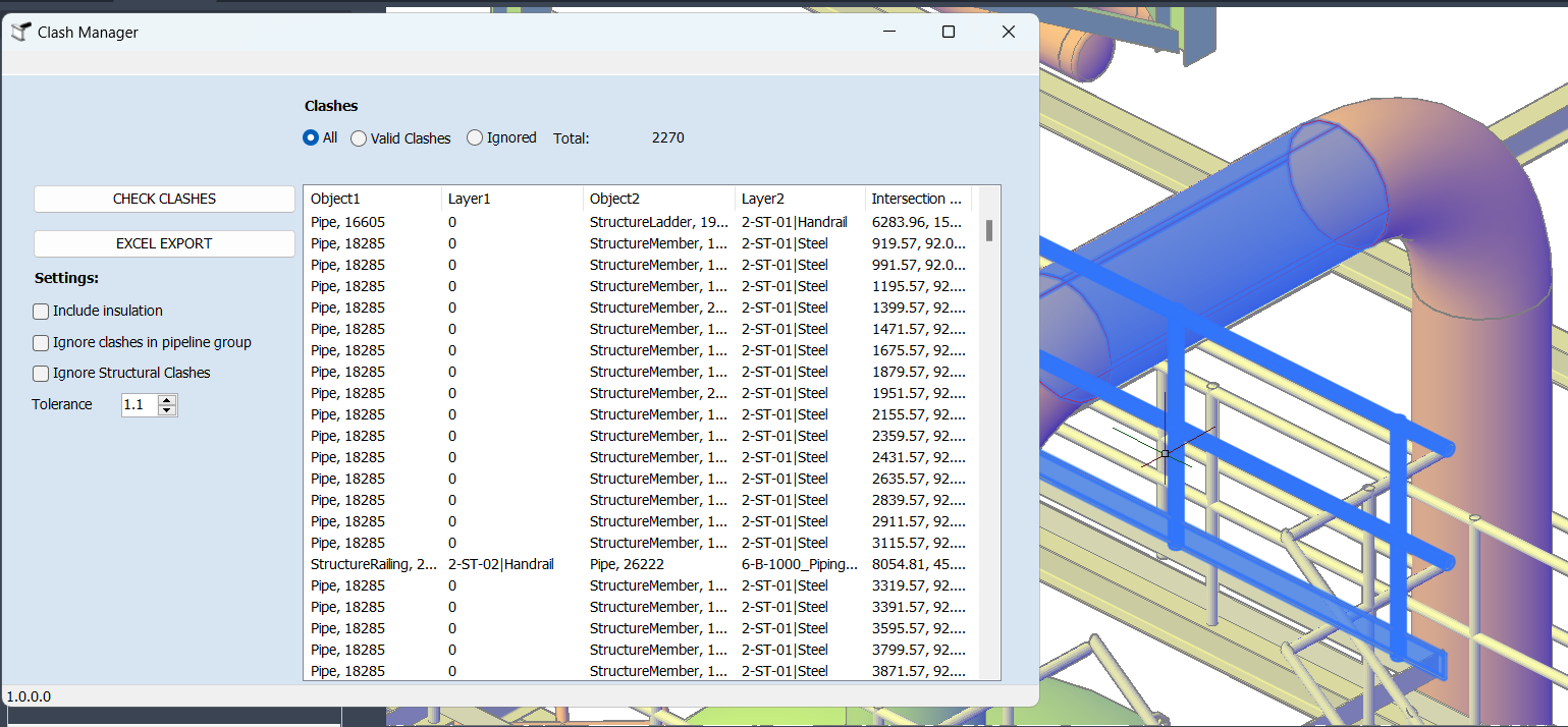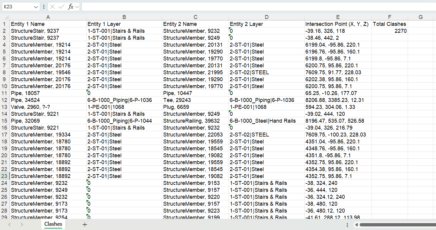 Generate detailed Excel reports that show object types, conflicting objects, layers, intersections, and total collision totals. Users don't have to check and scroll every time they want to resolve clashes; our application can now keep the information in an Excel file. Clash data for an entire plant drawing can be saved in seconds.