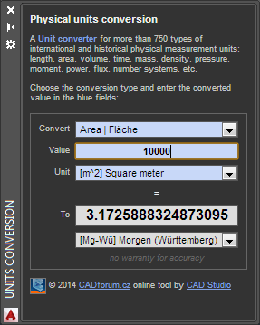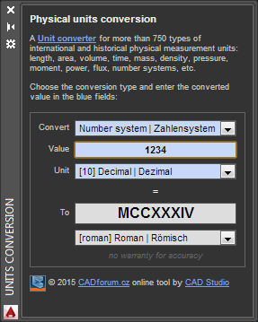 Converts over 800 hundred international and historical physical measurement units, not only from the CAD area - length, area, volume, time, mass, density, speed, pressure, force, moment, power, flux, numbers, luminous intensity, electric charge, etc. Convert U.S. Survey Feet to Furlongs or Russian Verstas or Roman Stadiums, Square yards to Hannover Morgen or Japanese Tsubos, Tea spoons to Litrons or Chinese Cuos, Slugs to Grains, Poundals to Dynes, Horse power to Refrigeration tons, Candelas to Hefner candles, octal numbers to hexadecimal or Roman numbers, etc.