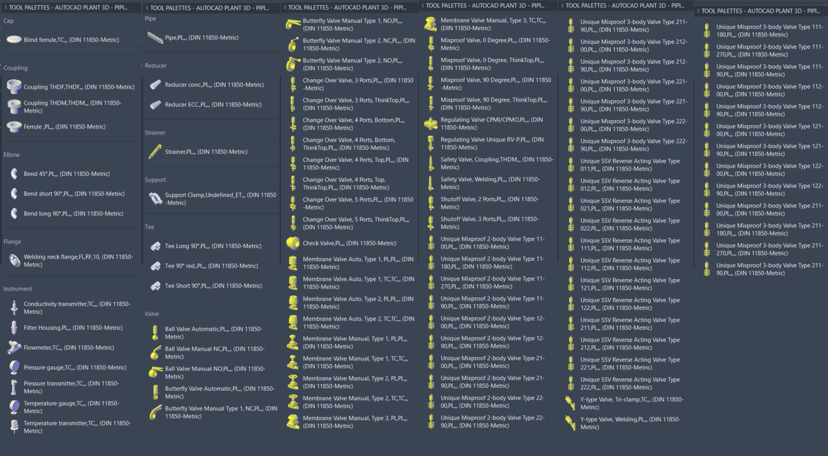 This package includes custom Python scripts for use in modeling DIN 11850 (EN 10357) piping in Autodesk® AutoCAD® Plant 3D. The catalog fully supports the export of Isometric drawings including a Mixproof 4-way valve, Change over valve, and shutoff valve. List of components see the Screenshot for more details.