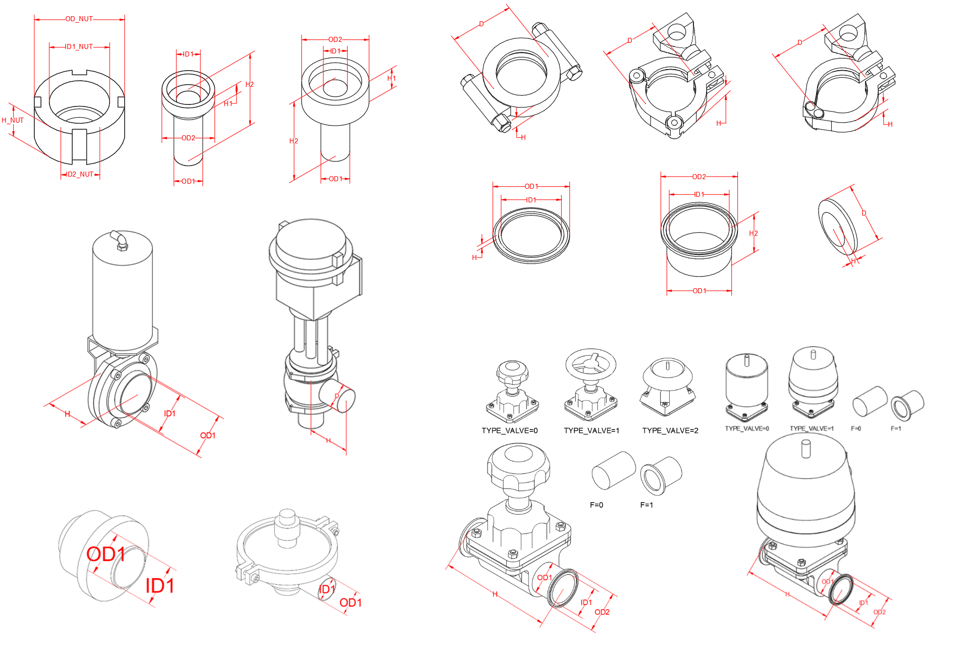 All components are custom Python scripts, so you can change the length pipe, number of ports, head automation, type of connection (plain, ferrule, or coupling), etc. DIRECTLY IN THE DRAWING