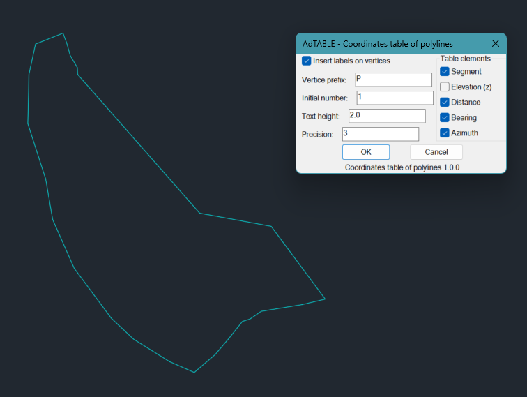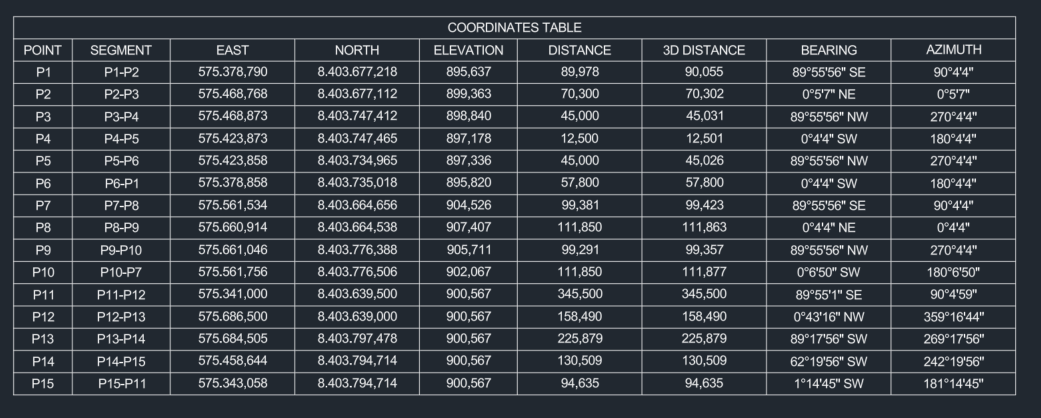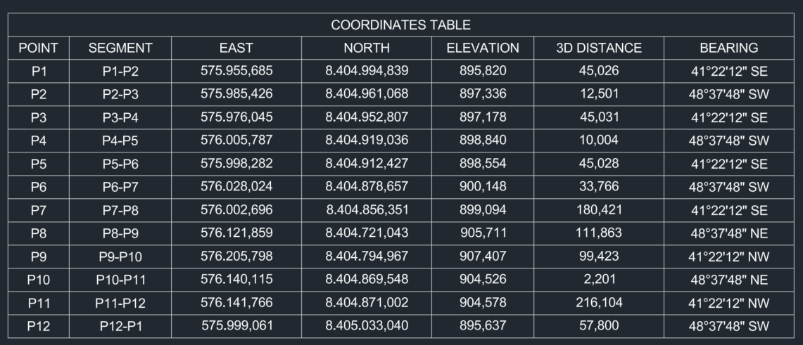 This app generates a coordinate table for polylines and 3D polylines. Using a dialog box, you can select whether to add labels to the objects and choose the information to include in the table: Segment, Elevation, Distance, 3D Distance (enable if there are 3D polylines on the selected objects), Bearing, and Azimuth. Each selected option adds a corresponding column to the table. The fixed columns are Point, East, and North. For the labels, you can configure the prefix, initial number, and text height. You can also set the precision for table data.