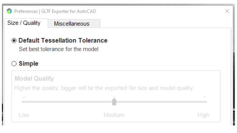 "GLTF Exporter for Autodesk® AutoCAD®” exports the model to a glTF (.glTF) and GLB (.GLB) file.