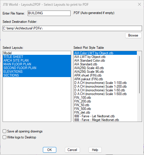 JTB Layouts2PDF helps you print selected layouts with the selected plot style to one pdf file. Your current Page Setup on each layout will be used.