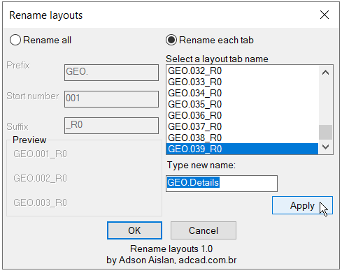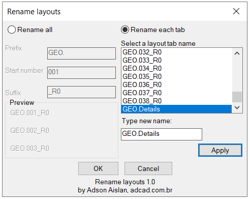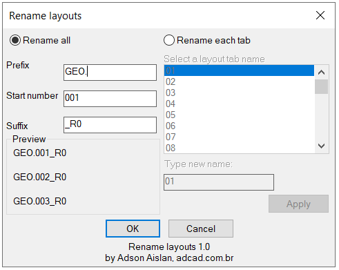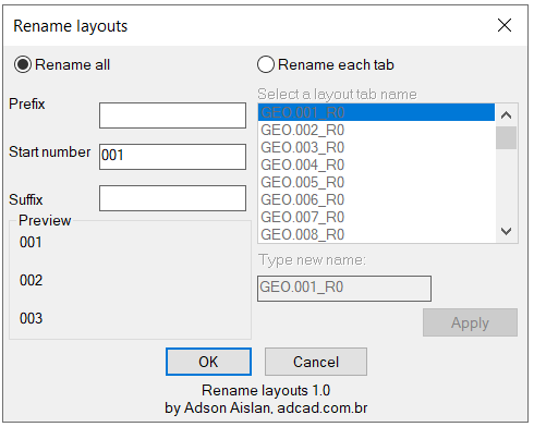 Using this app is very easy because it allows you to rename your file's layout tabs through an interactive dialog box. In the window that appears when the app starts, you can set a prefix, suffix, and start number to rename all layouts. You can also rename each layout with a different name in the dialog box, without accessing layout tabs.