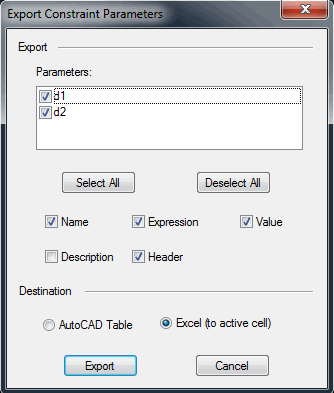- Export AutoCAD constraint parameters to Excel Workbook.