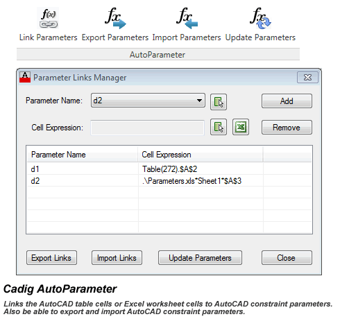 AutoParameter is designed to link the Autodesk® AutoCAD® table cells or Excel worksheet cells to AutoCAD constraint parameters (includes the dynamic block parameters).