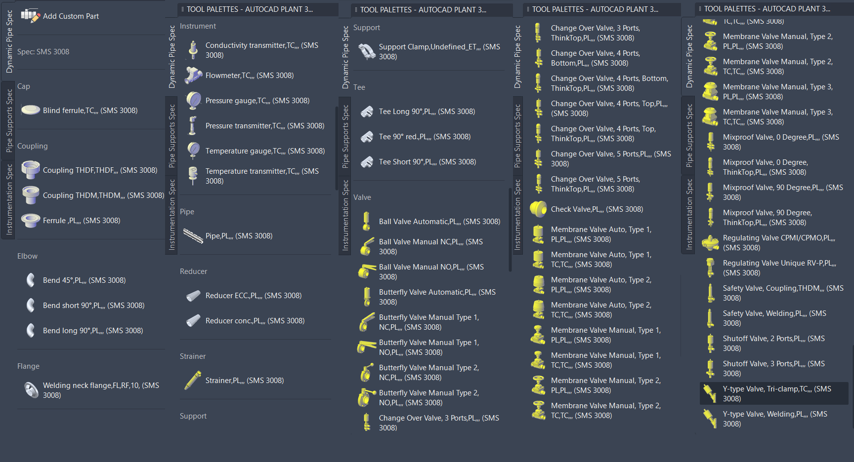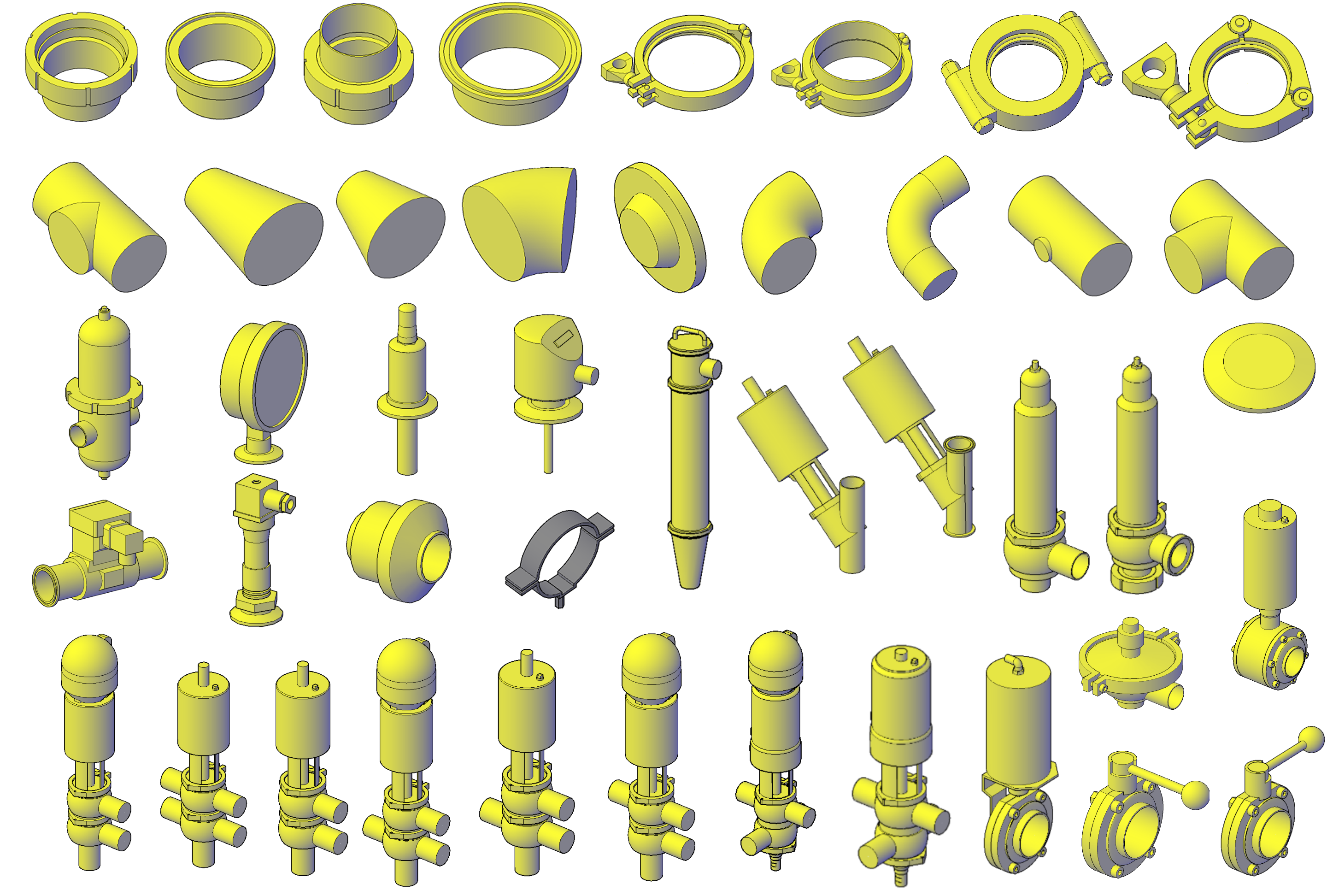 This catalog includes all common fittings, instruments, and valves used in Food and Beverage, Dairy industries with SMS 3008 standards. Highly customizable components include: Clamps, Coupling, Fittings, and Valves are Python custom script components. They are suitable for FMCG and dairy projects in Europe and Worldwide.