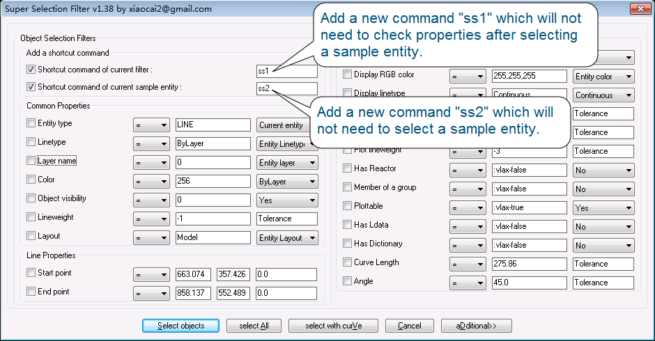 This app is useful to filter out those specific entities based on the properties of the selected sample entity, even the properties are not available in SelectSimilar and QSelect. Such as attributes of blocks, the effective name and parameters of dynamic blocks, RGB colors, array rows and columns, the number of vertices in a polyline, all nested blocks include the sample block, and so on.