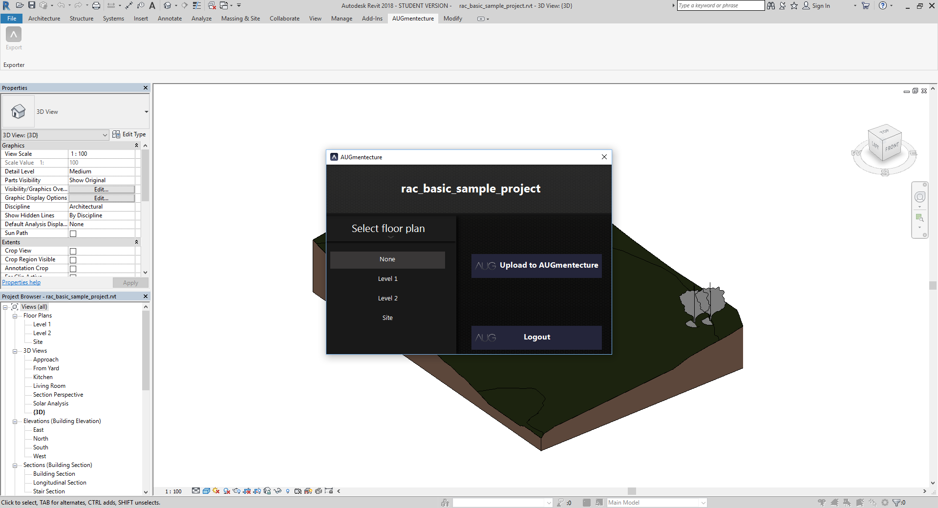 AUGmentecture is a service helping you to view complex 3D models on a mobile device in an Augmented Reality(AR) format. With the help of AUGmentecture plugin, you can seamlessly and securely upload your 3D models and floor plans directly from Autodesk® Revit® to your AUG account to view them later with your mobile device. You just need to select the model in 3D view and optionally select floor plan and you will be able to see the model on your mobile device mapped on your floor plan.