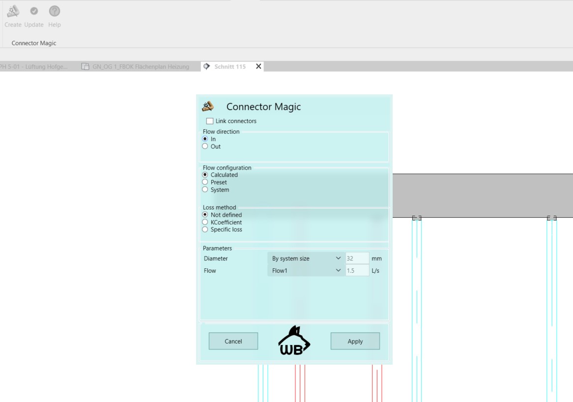 The tool brings a solution to save the effort and time by adding automatically special connector families and binding them to any family instances (which contain 3D solid) and any system in the model. So that even having one simple, family in the model, for example box shape, the user will be able to construct and automatically calculate the system without reworking the family.