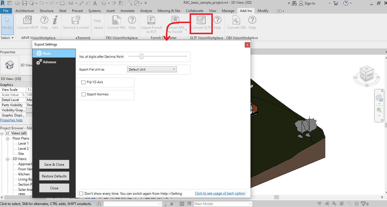 GLTF file is very usefull because of its reach set of feature and its size. This plugin will convert your Autodesk® Revit® Design to GLTF in order to use the Revit Model in different platforms like Unity3D, Unreal Engine, Web etc. Now a days people uses GTLF for AR VR application because of its size and loading speed.