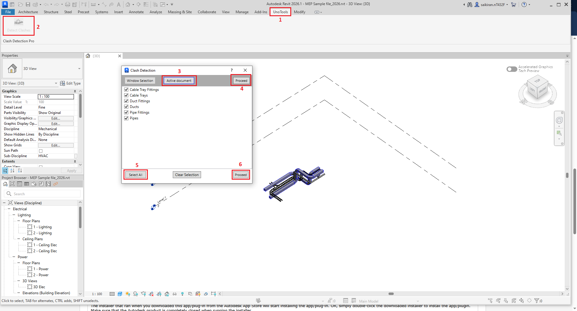 UnoTool_ClashDetectPro is a powerful Autodesk® Revit® plugin designed to detect and highlight clashes between elements within a Revit model.