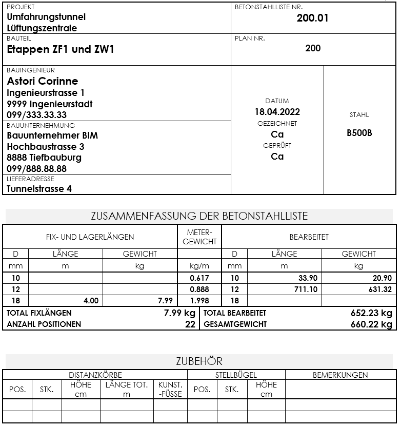 Erstellt eine Betonstahlliste für eine oder mehrere Teilungen nach den Schweizer Richtlinien oder nach ISO 3766:2003 (modifiziert) auf Deutsch, Französisch, Italienisch, Englisch, Dänisch, Holländisch, Polnisch oder Spanisch. |