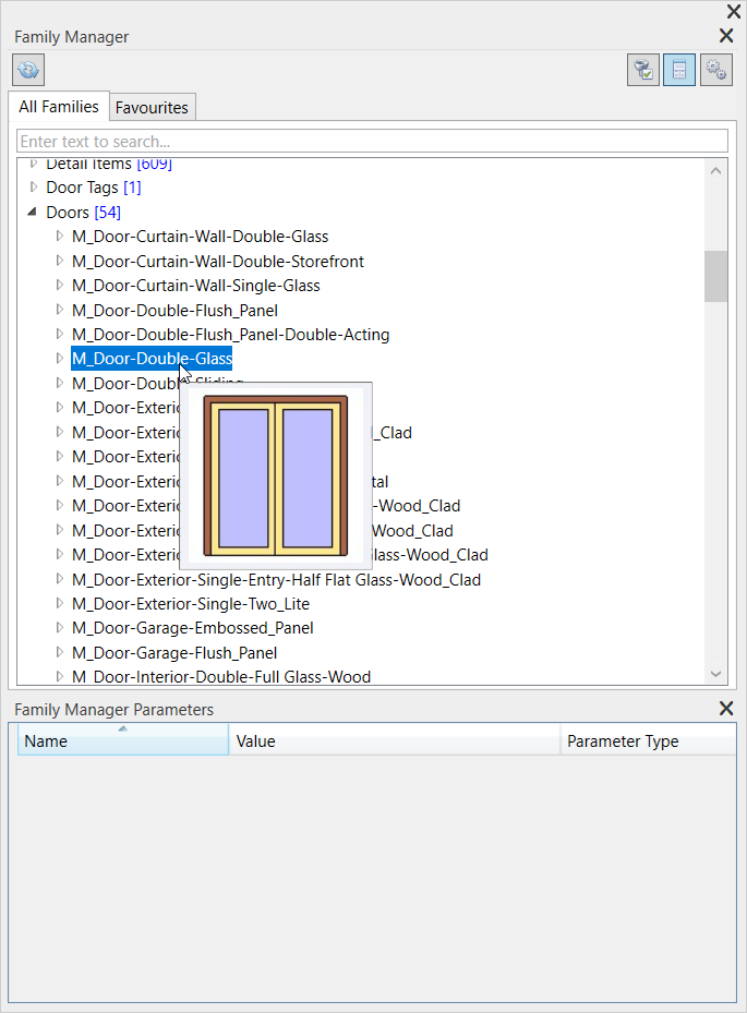 It displays the categories, families, types, and parameters.