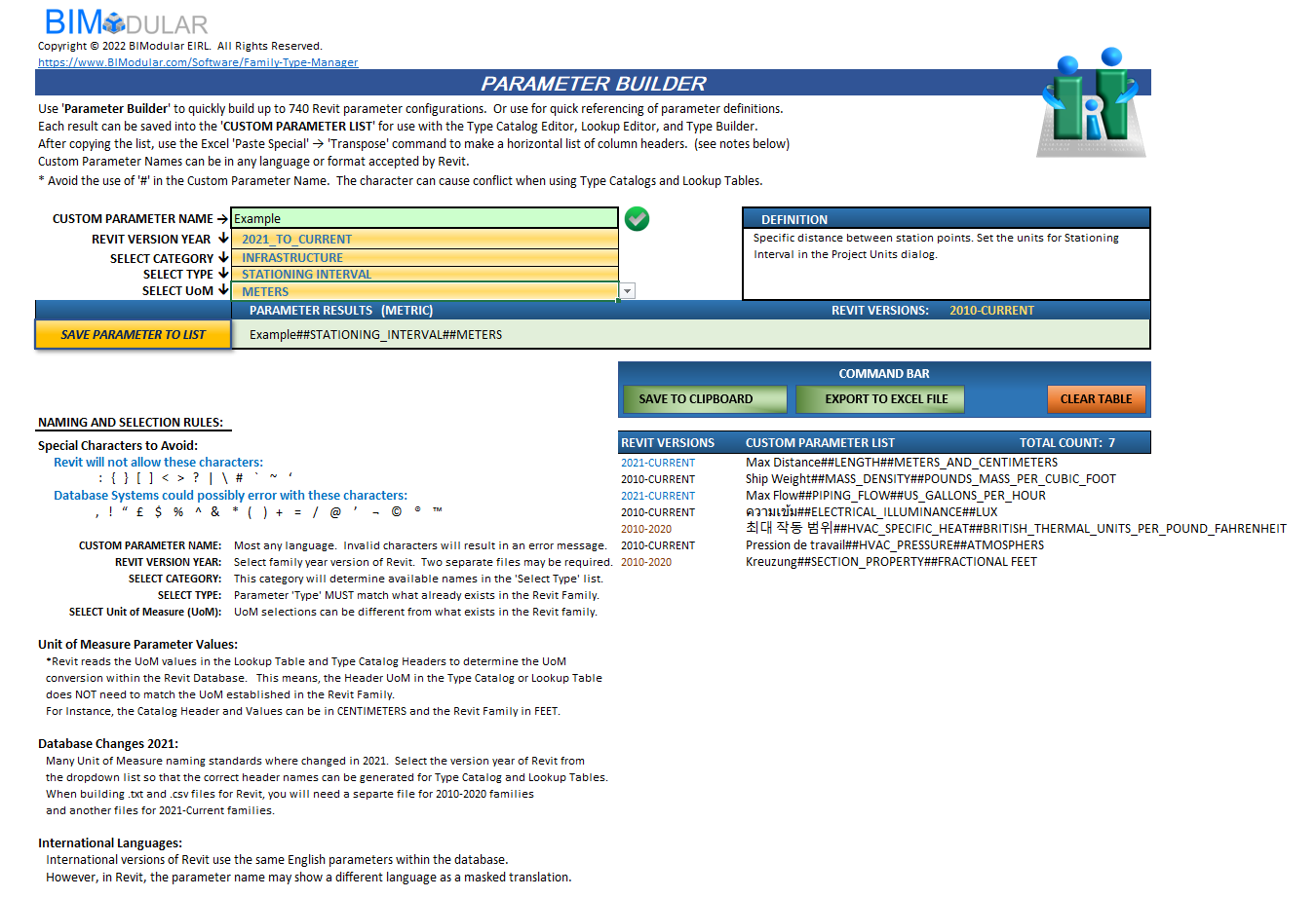 The program has a Type Builder feature that generates over 1 million unique combinations of family types in a matter of seconds, a Parameter Builder that generates all 740 Revit parameter types for creating column headers, a Unit of Measure Converter for bulk conversions between imperial and metric of up to 5 million values, and a document management Scratch Pad.