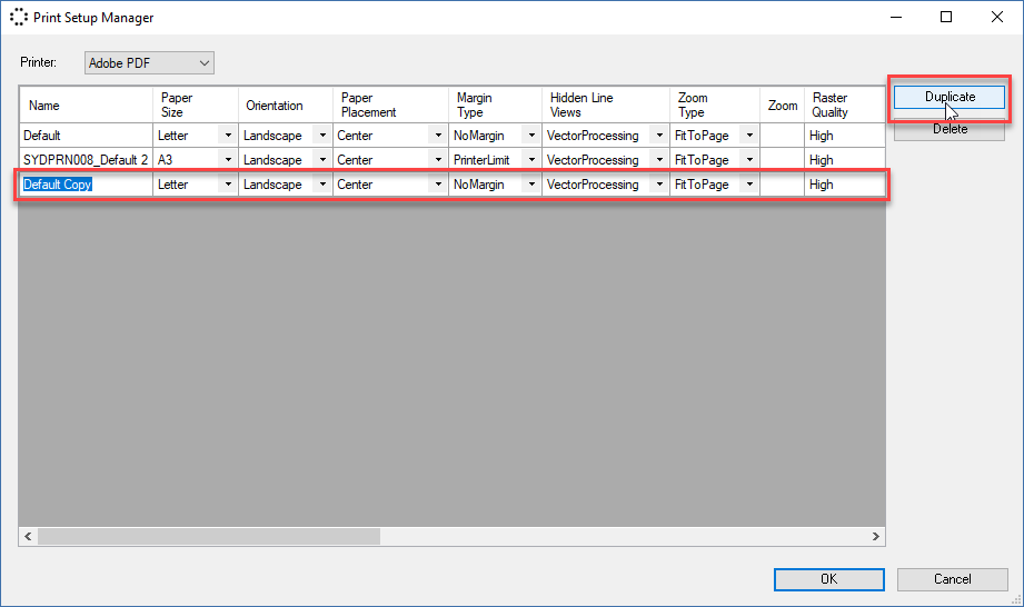 Note: For editing a print setup you should select a print driver. If the paper size in a print setup is not defined in the selected printer, that print setup won't be added to the mentioned table. You should first define the paper size in the printer preferences to access that print setup.