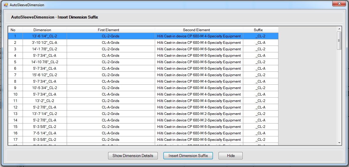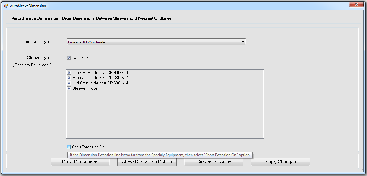ASD finds all available sleeves (Specialty Equipment) and draws dimensions to the nearest horizontal and vertical gridline for current view (floor). The user needs to provide two inputs - 'Sleeve Type' and 'Dimension Type' - in order to draw desired dimensions. It also allows the user to view dimension details, adding the suffix to dimensions with a click.