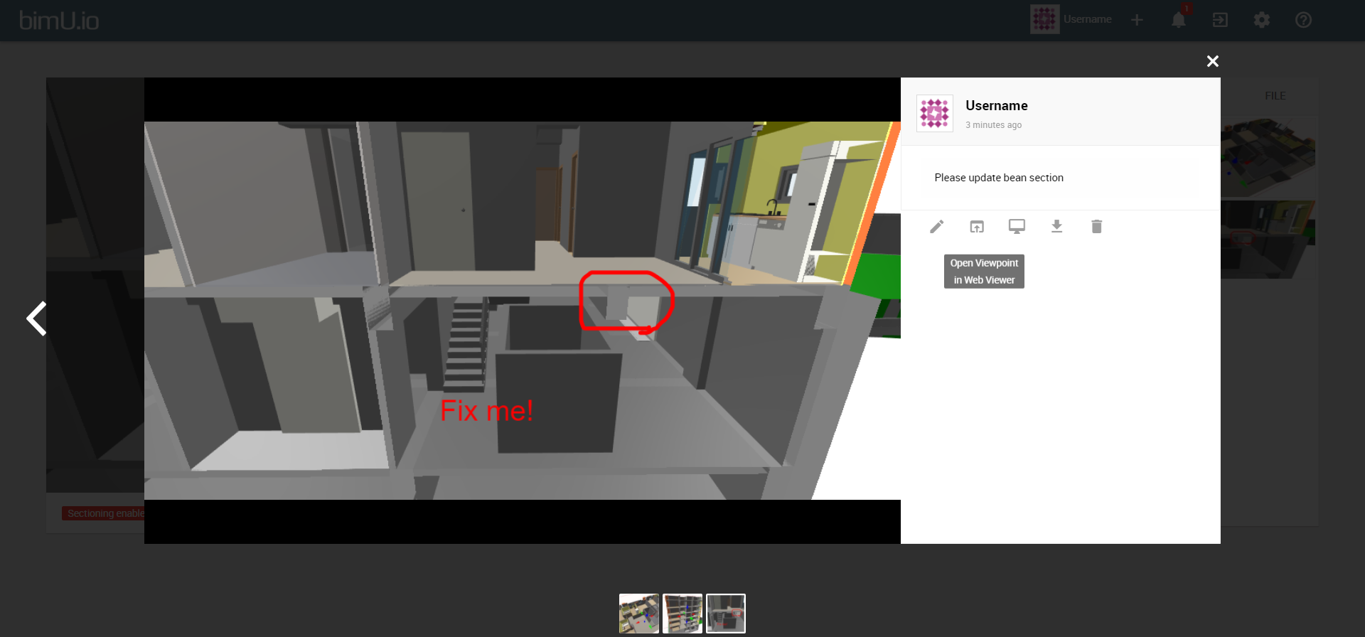 - Open a saved viewpoint in bimU.io 3D viewer or navigate to the same location in BIM software.