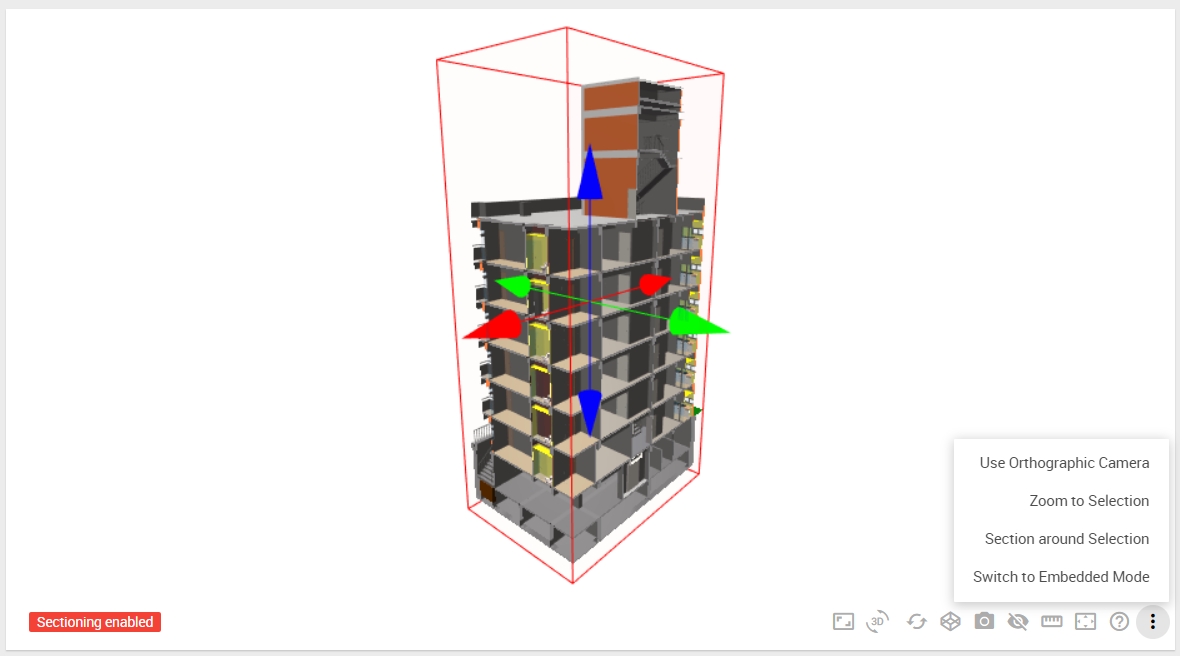 - A variety of 3D navigation tools, such as orbit, rotate, pan, zoom, zoom to fit, zoom to selection, section box, the section around the selection, hide elements, measuring tools, fullscreen mode, etc.