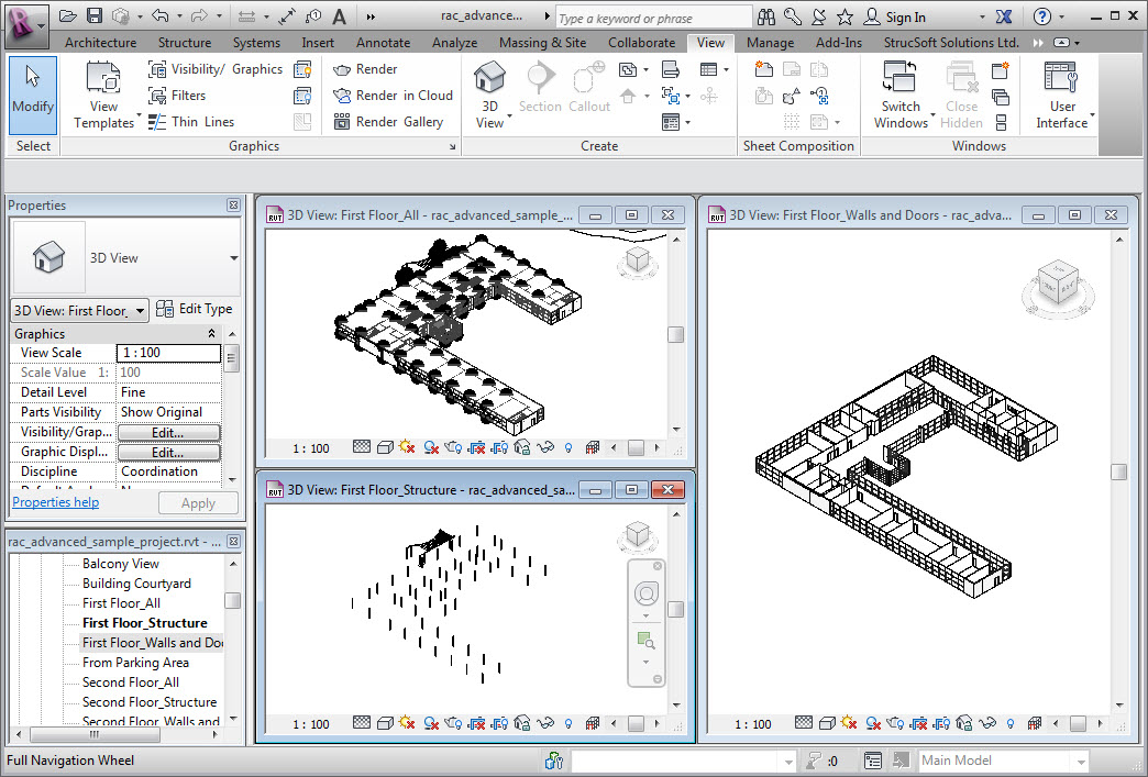 DPR Model Slicer is a free Autodesk® Revit® plug-in that facilitates the creation of 3D Building sections from a Revit model. Inherently within Revit, the only way to separate a model by the floor is to filter it by reference levels. Unfortunately, this often results in a product (shown below), where items modeled as multi-floor elements, such as walls or columns, become associated with only one floor despite occupying space on many floors.