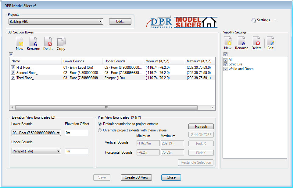 When in the DPR Model Slicer "Create 3D Sections" tool click every row to get the "Minimum (X,Y,Z)" and "Maximum (X,Y,Z)" to populate. Click any of the rows in visibility settings. The “Save” Button should light up. Click “Save”. Once values are set you can click "Create 3D View" to make the views. At this stage you should be good.